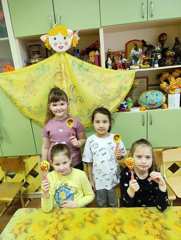 Далее юные художники старших групп расписали, используя элементы хохломской росписи, деревянную лопатку. А юные художники подготовительных групп расписали деревянную ложку.