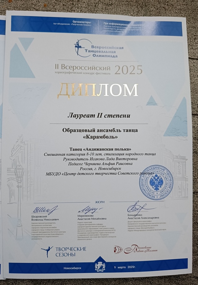 9 марта на Международном конкурсе «Всероссийская Танцевальная Олимпиада» юные танцовщицы представили три танца и были отмечены дипломами лауреата II и III степени.