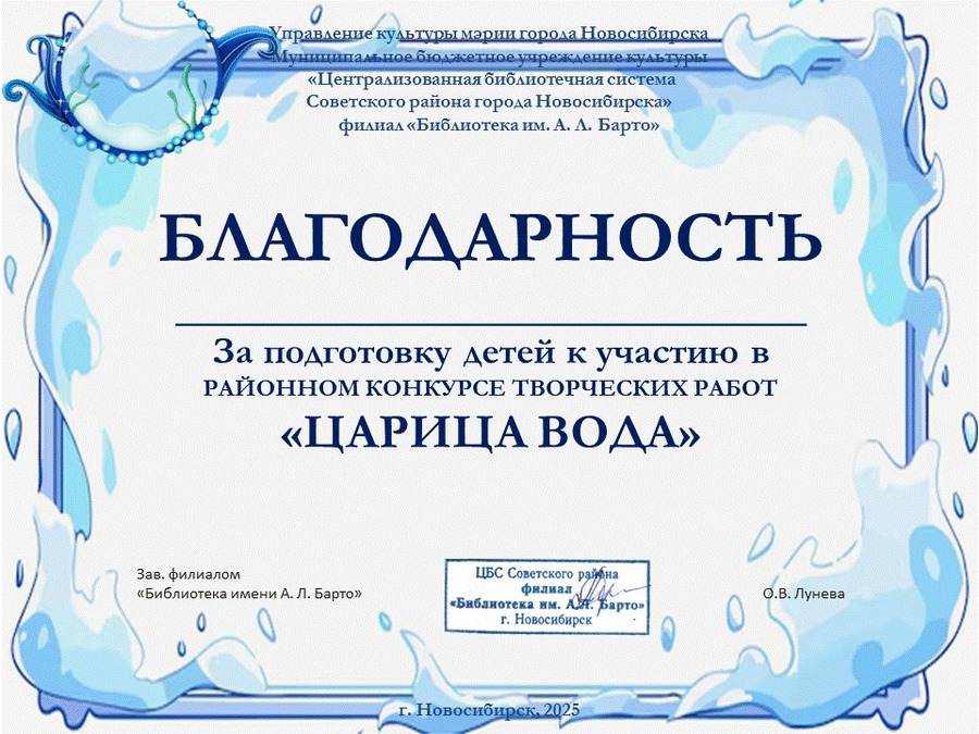В субботу подвели итоги конкурса «Царица вода» в детской библиотеке имени А. Барто. Ребята мастерской «Нити творчества» ЦДТ Советского района Шестакова Виктория, Лакина Ангелина и Корнейчук Марию заняли 1 место.