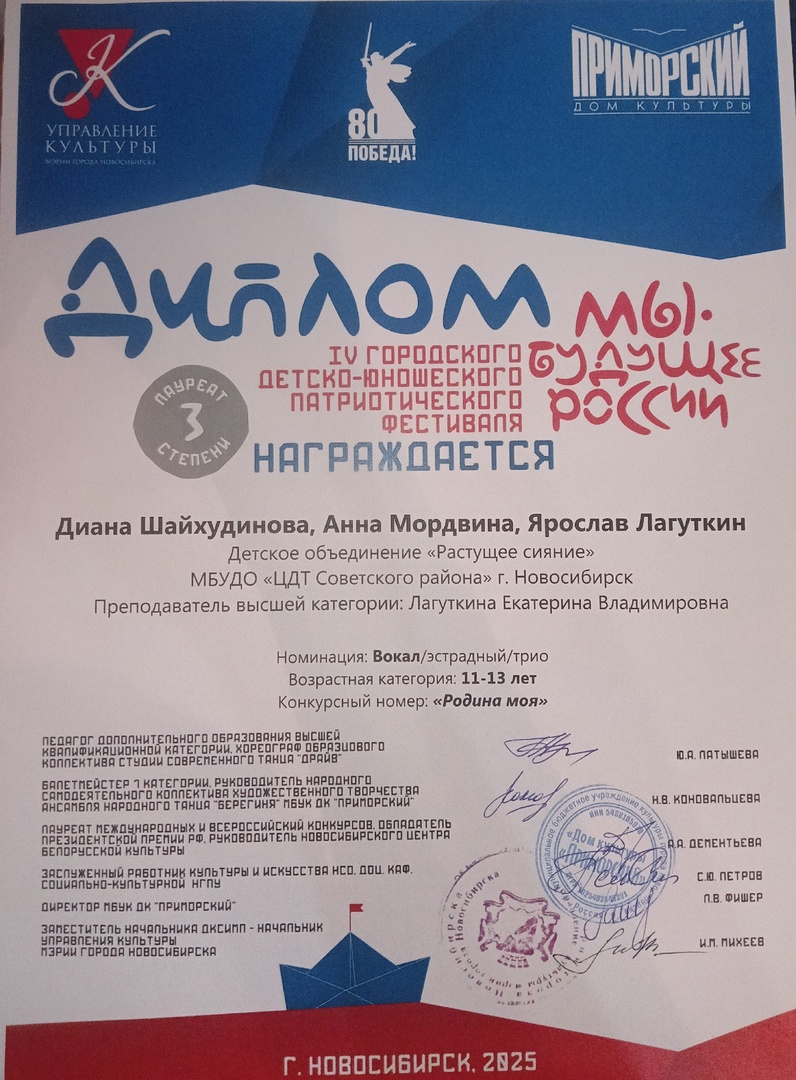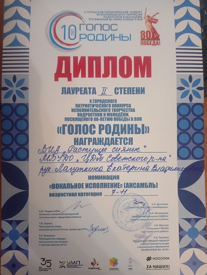 Обучающиеся детских объединений ЦДТ Советского района: ДО «Блок-флейта» и ДО «Растущее сияние» приняли участие в двух вокальных конкурсах: X городском патриотическом конкурсе исполнительского творчества «Голос Родины» и IV городском детско-юношеском патриотическом фестивале «Мы – будущее России». Исполнение песни было отмечено жюри обоих конкурсов дипломами Лауреатов II и III степени.