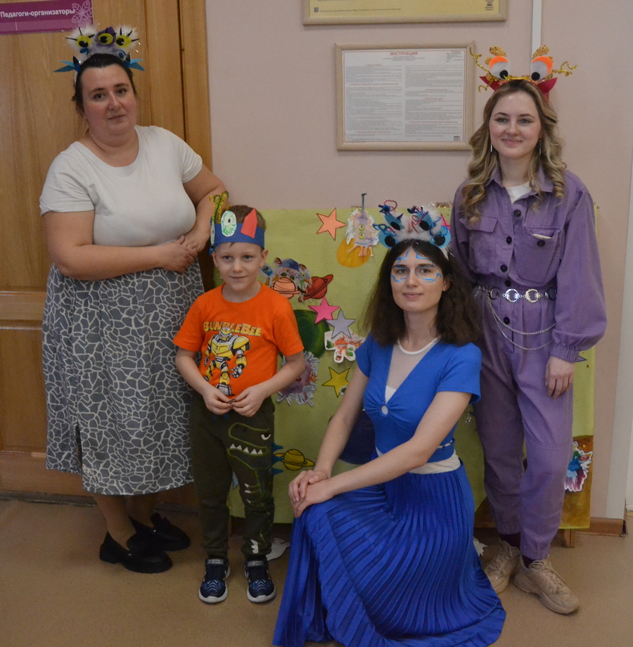 Участники праздника вместе с педагогами отправились в космическое путешествие: две команды поочерёдно прошли мастер-классы, на которых рисовали необычных инопланетян, разгадывали ребусы и создавали маски.