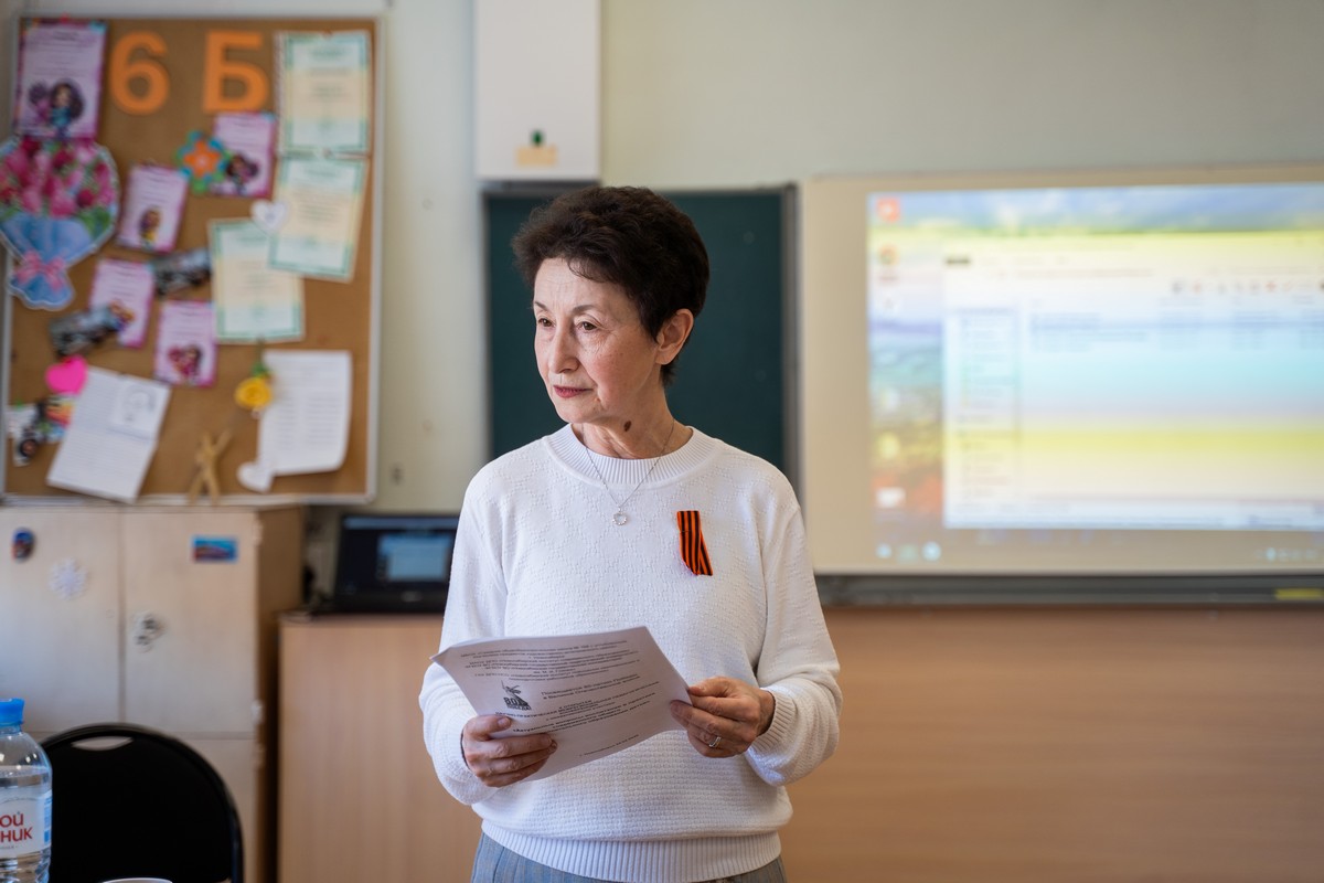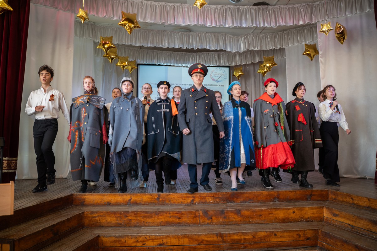 Патриотическую тональность конференции продолжила музыкально-театральная композиция «Хотят ли русские войны» в проникновенном исполнении обучающихся 7-9-х классов. Необычным было решение использовать созданные учениками школы под руководством учителя изобразительного искусства Фоменко Тамары Яковлевны шинели по образам песен Великой Отечественной войны.