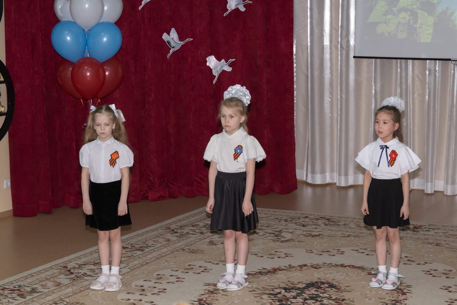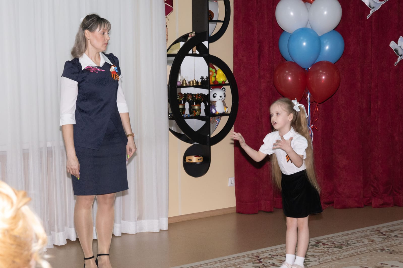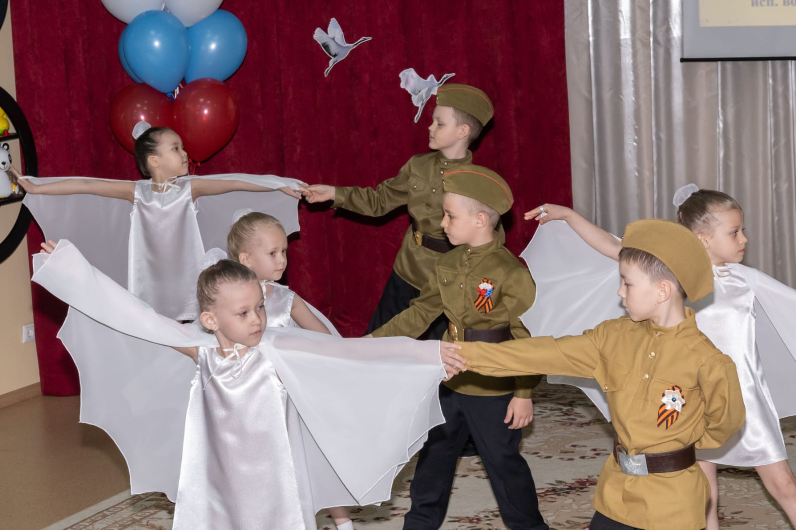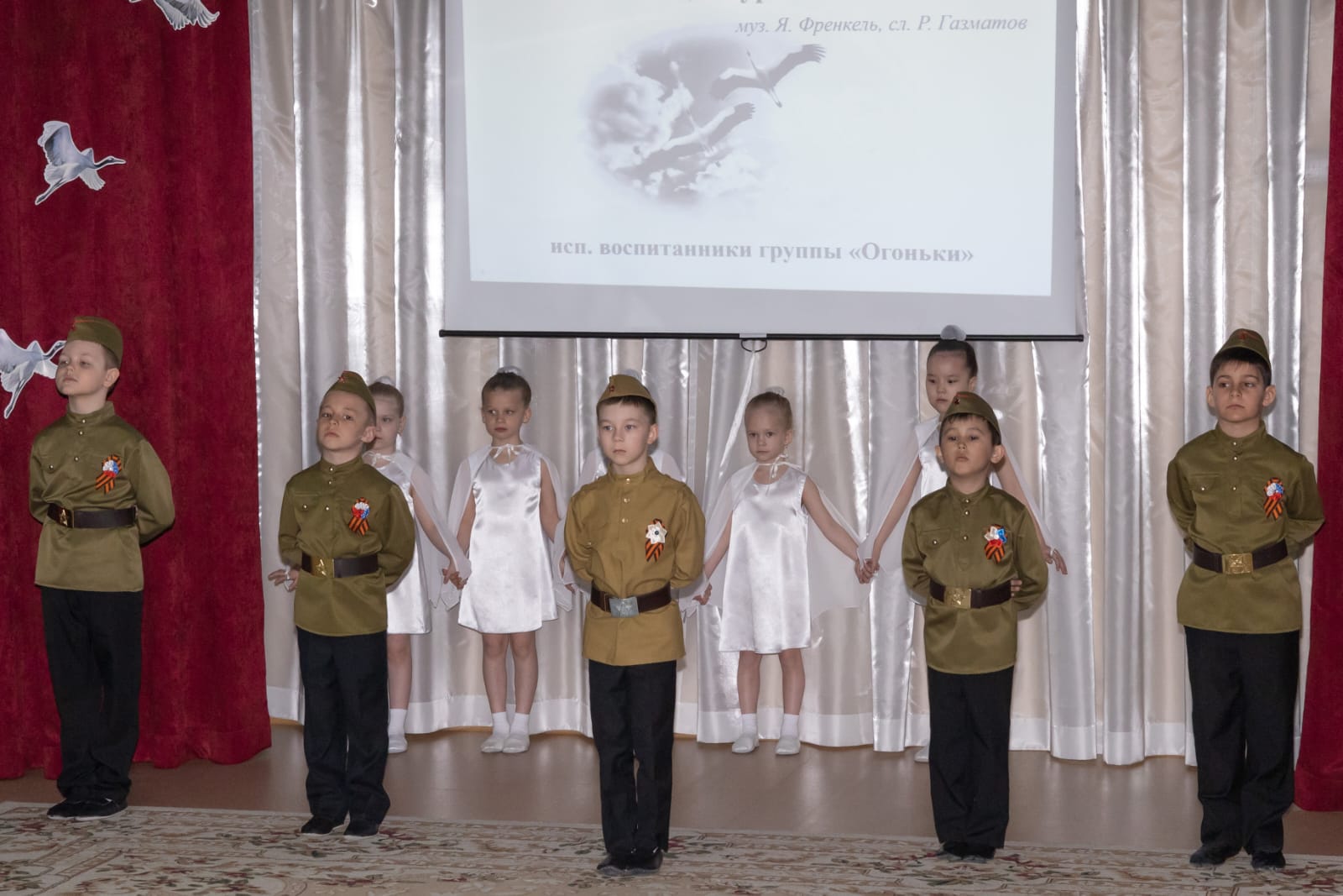 А потом были замечательные номера, выполненные с душой: хореографическая композиция «Россия», представленная воспитанниками группы «Полянка» (воспитатели Назарова И. В. и Павелкова А. В.), танец с полотнами «А закаты алые» представили пятилетние девочки из группы «Ручеек» (воспитатели Шмидт И. Н. и Пушкарева Л. А.); стихотворение «Почему в России выстрелы гремят» исполнили воспитанницы группы «Полянка» с воспитателем Назаровой И. В.; а сколько души вложили дети из группы «Огоньки» (воспитатели Метельская Е. С. и Глебова С. В.) в композицию «Журавли»! Когда на последних аккордах, уходя от нас, они повернули к зрителям свои сосредоточенные лица, как бы говоря: «Не забывайте нас!», мороз пошел по коже. Точно также на одном дыхании хореографическая группа «Атика» представила танец «Небеса»; зал просто замер, когда появились эти красивые девушки в длинных белых платьях и, выдохнув на последних звуках песни, взорвался аплодисментами. А как исполнила песню «Катюша» Ю. В. Данченко, наш музыкальный руководитель! Глядя на нее, задорно пританцовывавшую, в солдатской гимнастерке и пилотке, кажется, что перенесся в те страшные времена, и эта девчонка сейчас потащит на себе с поля боя раненого бойца.