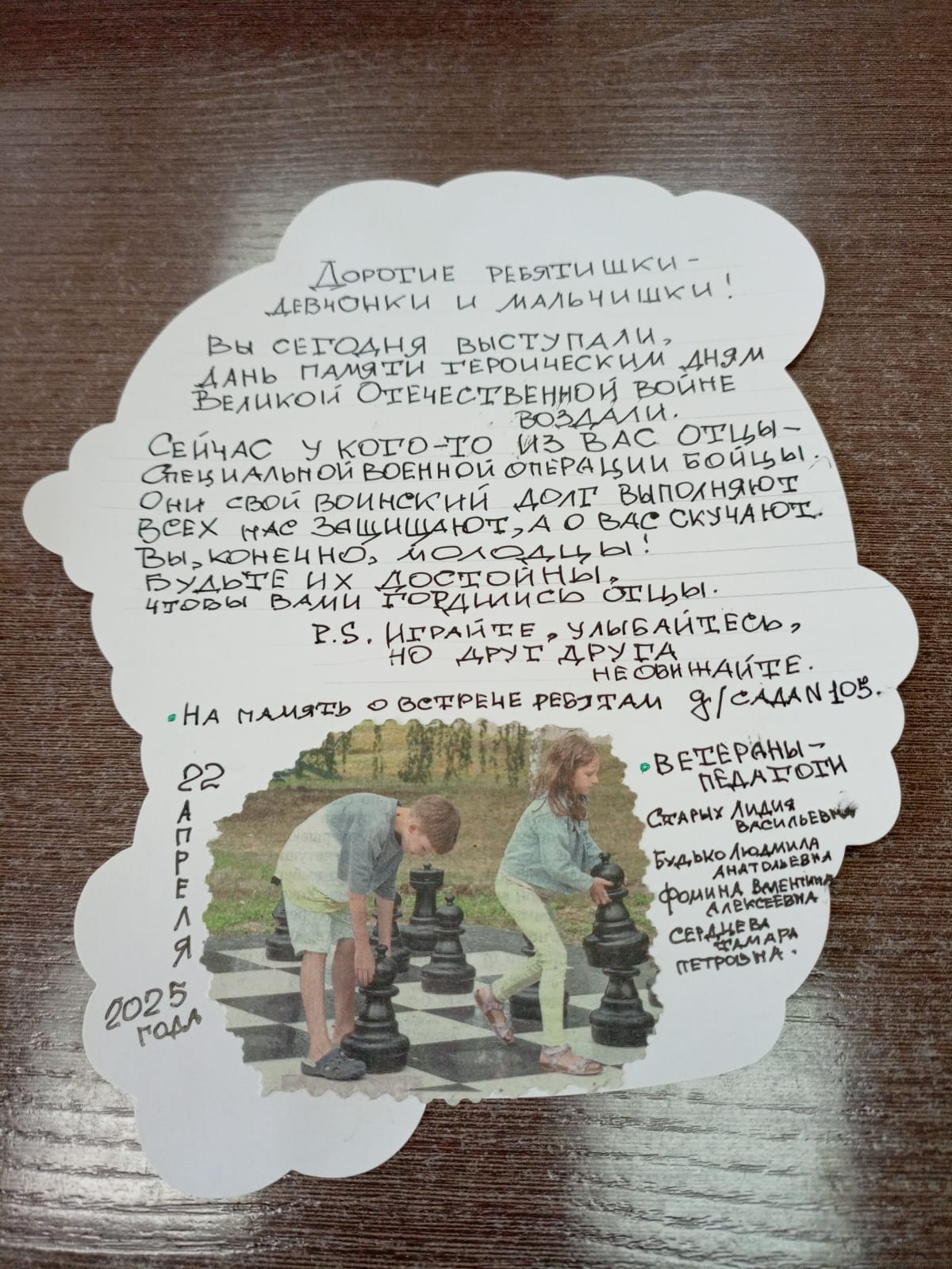 В завершении Л. В. Старых, председатель патриотической комиссии Совета ветеранов Дзержинского района, подвела итог нашего героико-патриотического мероприятия и вручила открытку с напутствием нашим детям. А ветеран школы № 87 Людмила Анатольевна Будько, растрогавшись, сказала столько добрых слов про патриотическое воспитание в нашем детском саду, что тронула до слез, пожалуй, всех присутствующих.