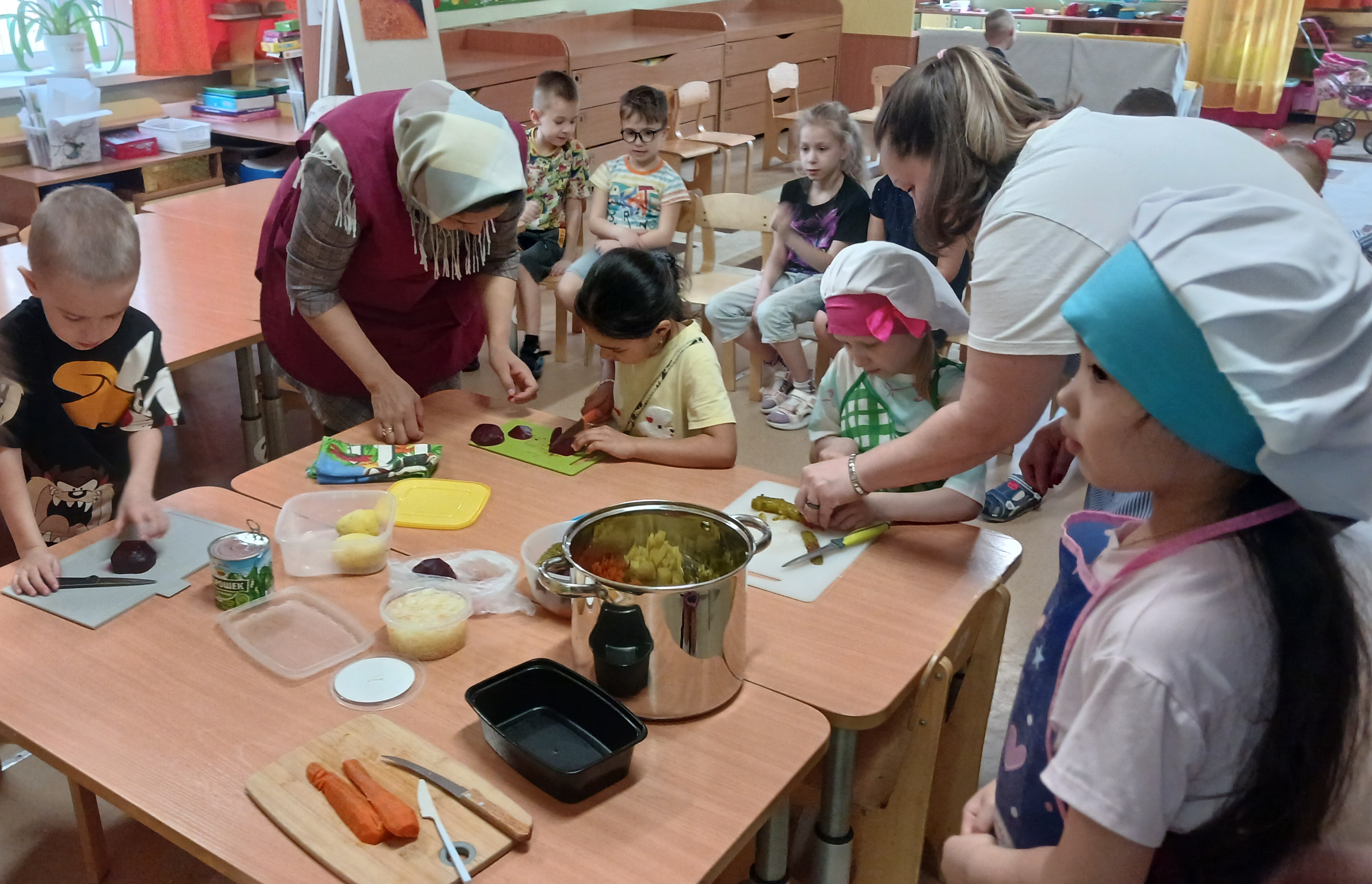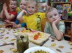 В апреле, используя образовательную технологию «Семейный эдьютеймент», педагоги совместно с детьми предложили родителям провести мастер-класс по приготовлению вкусного и полезного блюда – винегрета. Родители с удовольствием поддержали эту идею. Мастер-классы по приготовлению прошли в нескольких группах: в старшей группе «Сказка» и в подготовительных группах «Рябинка» и «Солнышко». Так в группе «Сказка» с приготовлением полезного салата ребятам помогали воспитатели, а родителей угостили уже после ужина, когда они начали приходить за детьми. Винегрет получился очень вкусный, и родители были очень довольны такому угощению. В группе «Рябинка» несколько родителей проявили инициативу и смогли научить каждого ребенка резать овощи, готовя вкусный и полезный салат. В группе «Солнышко» родители помогли с ингредиентами для салата, а ребята с воспитателями приготовили салат и съели его на ужин.