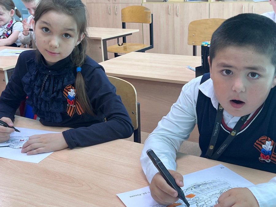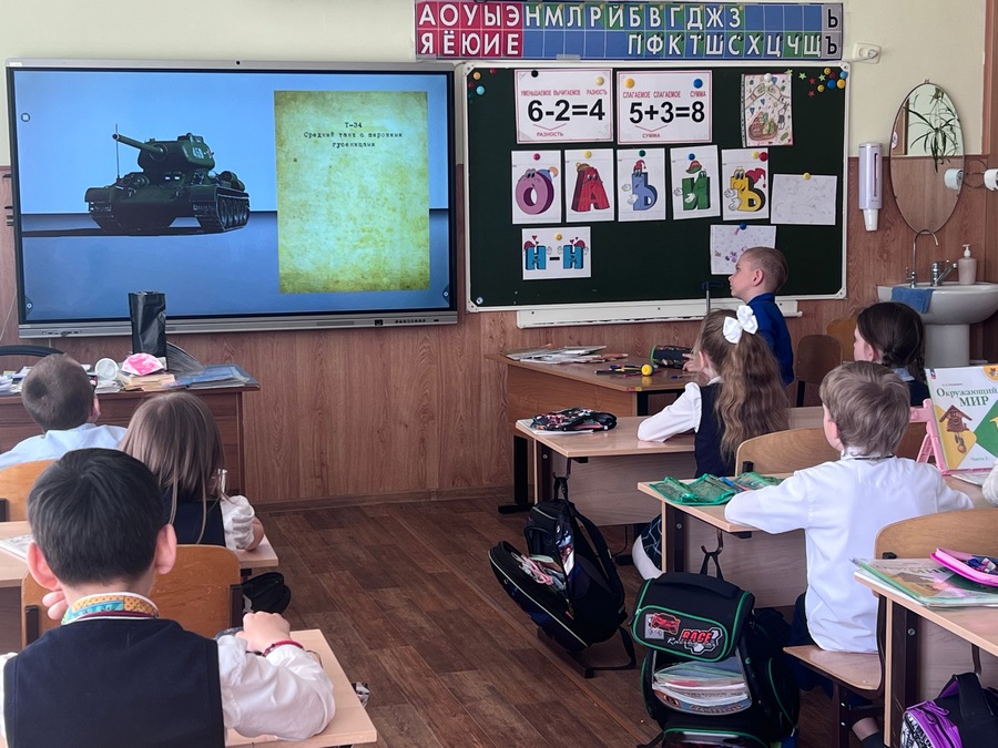 Тема урока – Броня Победы. В рамках занятия обучающиеся узнали о подвигах русских танкистов и истории побед танка Т-34, о защитниках и героях Сталинградской битвы.