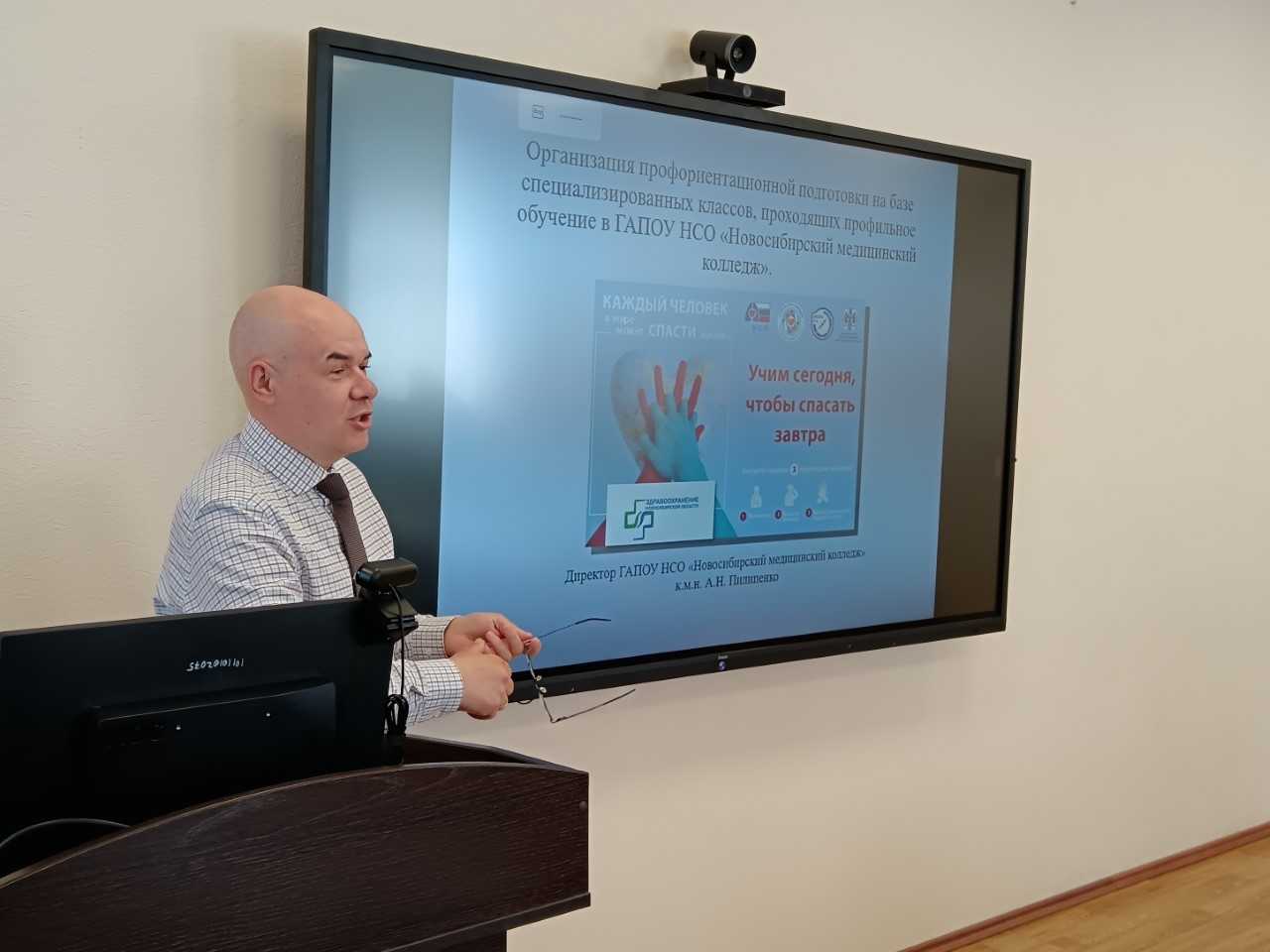 Открыл совещание Рамиль Миргазянович Ахметгареев, начальник департамента образования мэрии города Новосибирска: «По статистике, медицинские профессии входят в топ-10 самых востребованных в стране. Новосибирск одним из первых отреагировал на этот вызов. В городе специализированные медицинские классы появились в 2021-2022 учебном году. В настоящее время их уже 18, а в этом году ожидается первый выпуск 11 класса. За 4 года впервые проводится подобное совещание, в ходе которого важно не только подвести итоги, но и обменяться опытом».