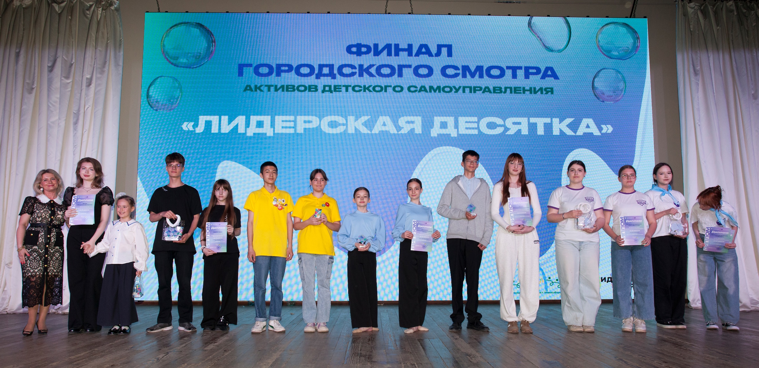 Церемония награждения конкурса «Лидерская десятка» прошла динамично, вызвав яркие эмоции у участников и зрителей. Атмосфера была наполнена энергией и позитивом. Под громкие аплодисменты всех присутствующих участников тепло поприветствовали и торжественно вручили дипломы департамента образования мэрии города Новосибирска, а также ценные призы победителям и лауреатам: