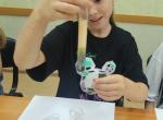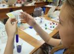 Участники мастер-класса собирали из модулей конструктора молекулы хлороводорода (HCl) и гидроксида натрия (NaOH). Затем они смешивали растворы и наблюдали за удивительными превращениями: бесцветная жидкость становилась ярко-оранжевой, а после добавления белого порошка – зелёной. При взбалтывании жидкость приобретала насыщенный синий цвет.