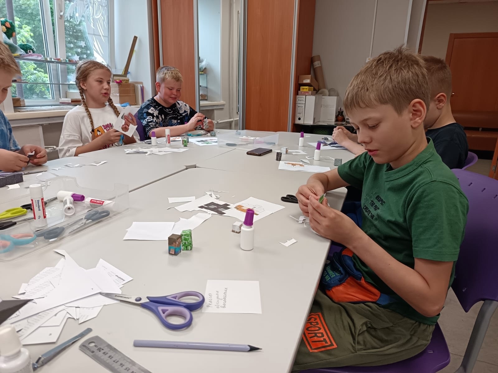 Рогова Юлия Петровна погрузила ребят в мир создания объемных открыток. Дети работали с шаблонами, компоновали элементы внутри открытки, собрали персонажей игры «Майнкрафт» и объемную звезду. На следующих занятиях дети познакомились с полигональным моделированием.