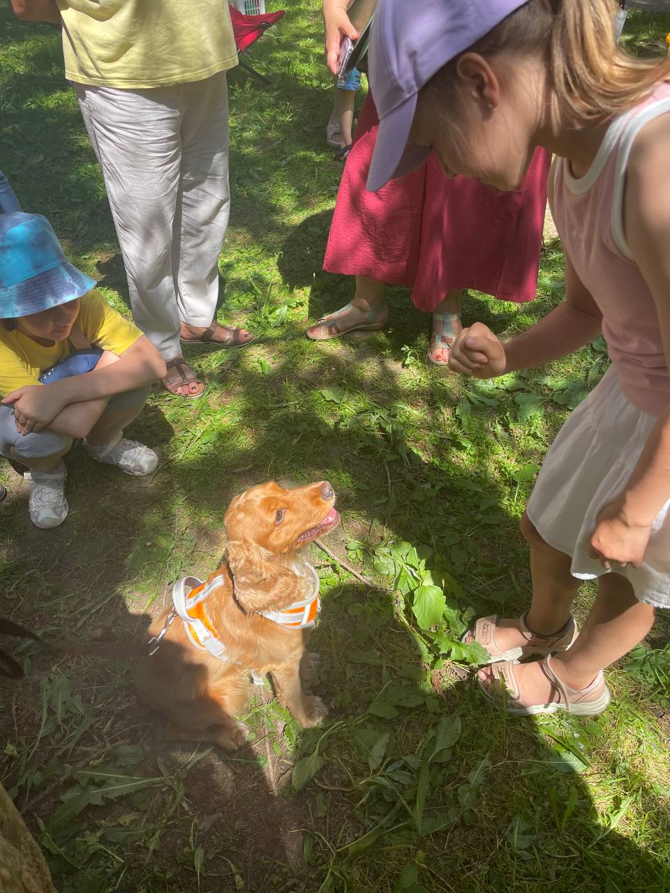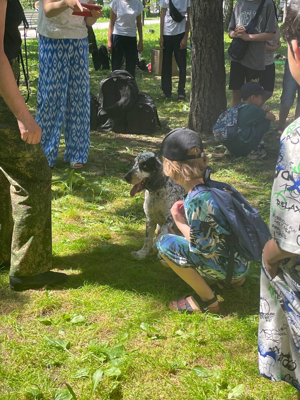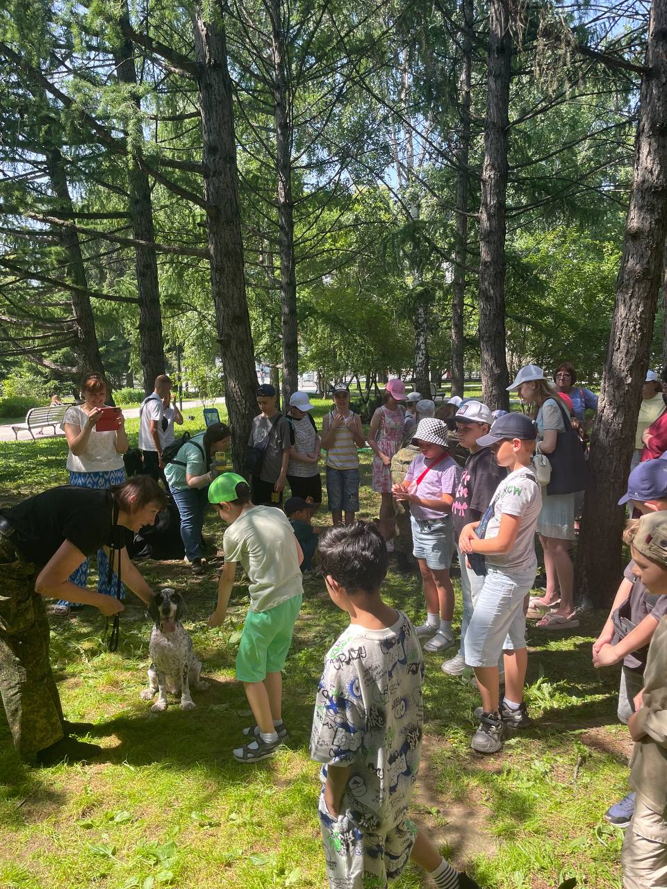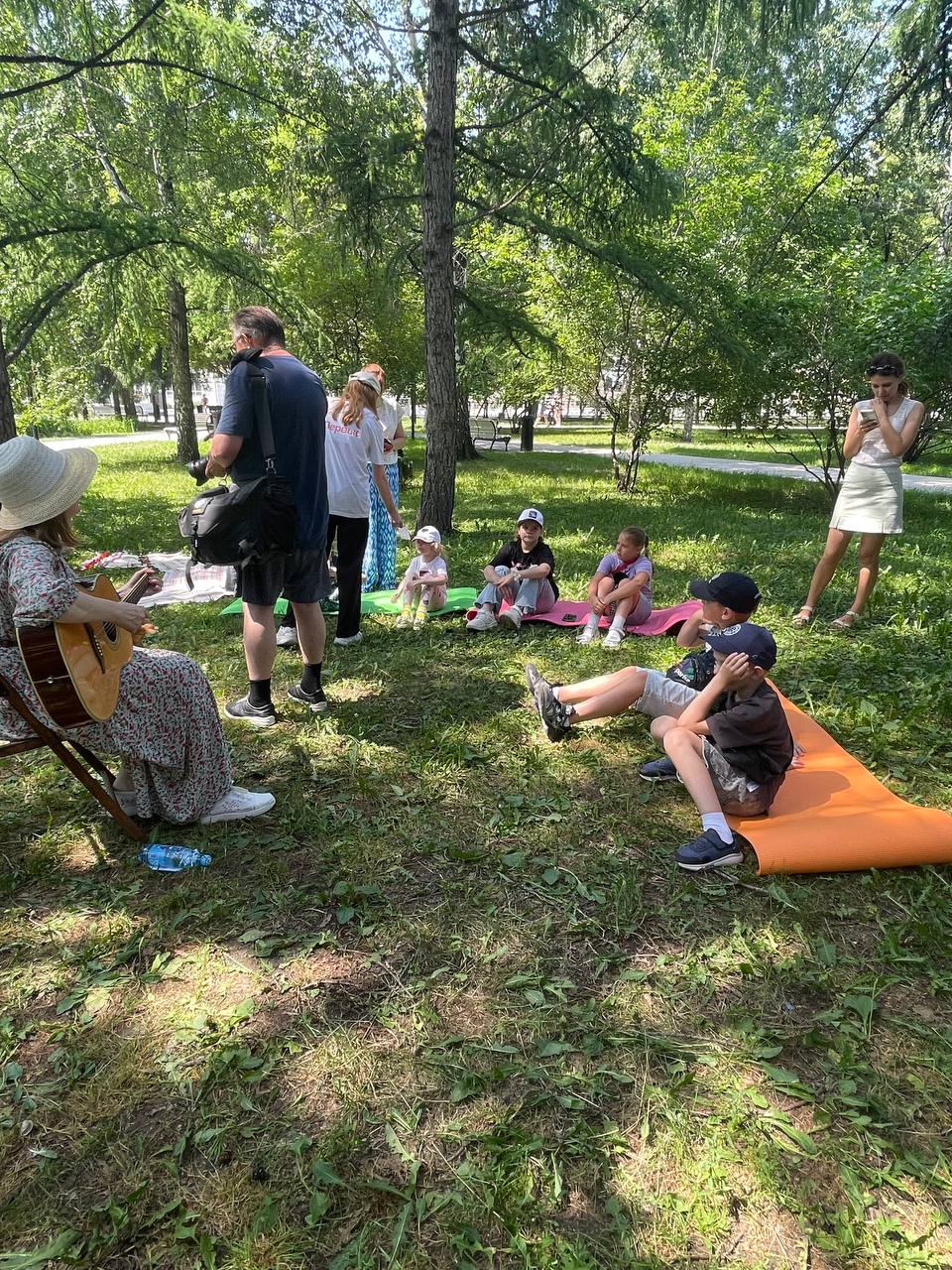 Позже к участникам встречи присоединилась библиотекарь и экскурсовод Алина Кранчева. Под гитару она исполнила песни из советского детства, а взрослые и дети, сидя в кругу, подпевали ей. Они спели такие песни, как «Это знает всякий», «Пропала собака». Так как дети познакомились со служебными собаками и кинологами, Алина решила продолжить эту тему.
