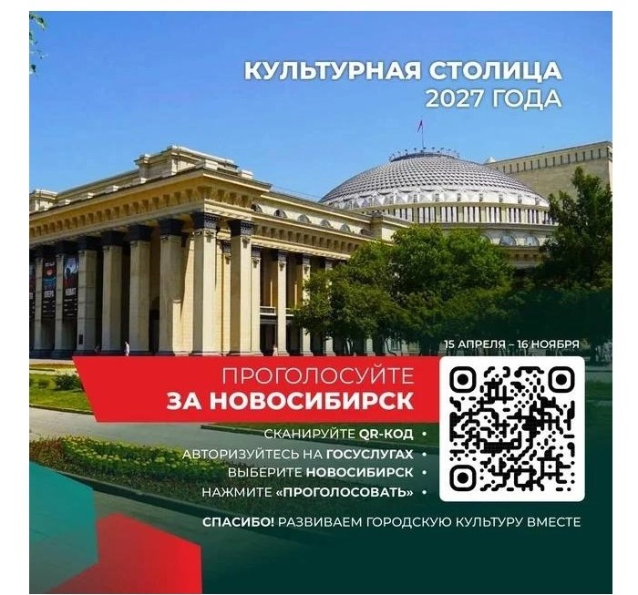 Народное голосование продлится до 16 ноября 2025 года. Поддержать Новосибирск может любой человек, имеющий аккаунт на портале Госуслуги по ссылке: https://pos.gosuslugi.ru/lkp/cultural-capital/contest/13/