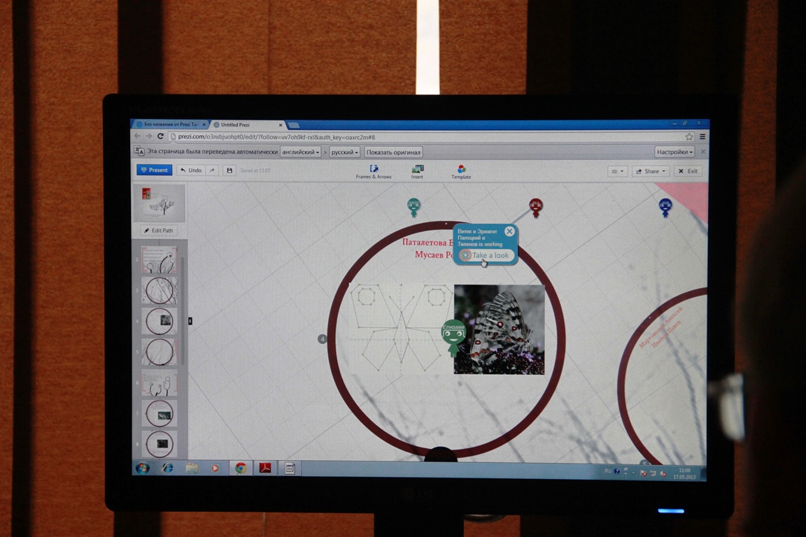 Урок математики был интегрирован с информационными технологиями, а также красной нитью проходила тема 2013 года – года защиты окружающей среды. Ученики накануне выполняли творческое домашнее задание – построение по точкам фигуры представителей флоры и фауны, нуждающихся в защите: ученики выбрали «подопечного», получили координаты точек, которые необходимо расположить на координатной плоскости для составления изображения, а также подготовили краткое сообщение о выбранном «подопечном». И уже на уроке они представили свои замечательные работы, построив изображения в сервисе http://livegeometry.com/. После построения фигур, учащиеся загрузили свои работы в общую презентацию Prezi.com. На данном уроке математики ученики, помимо основной темы («Координатная плоскость»), получили опыт работы с сетевыми сервисами, работая в сервисе «Живая геометрия», публикуя свои работы в общей презентации. В конце урока Татьяна Александровна получила рефлексию от учащихся («Я знаю, я умею, было непонятно») и поблагодарила за работу.