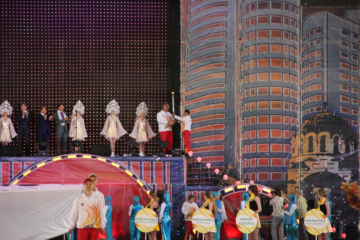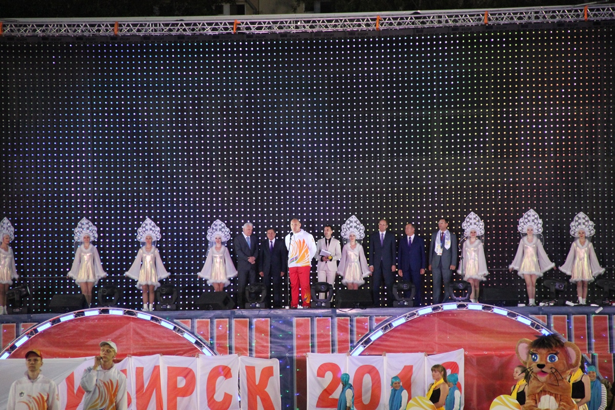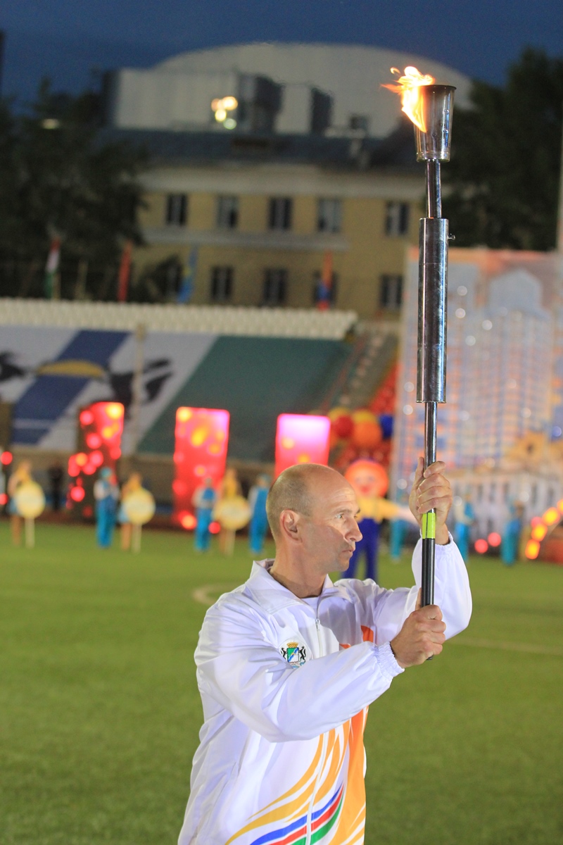 Торжественная церемония началась c факельной эстафеты, которая стартовала от монумента Александру Покрышкину и финишировала на стадионе «Спартак». Факелоносцами стали победители Олимпийских игр: Виктор Маркин, Ирина Минх, Лина Чирязова, Сергей Тарасов, Анна Богалий, Евгений Подгорный, Александр Карелин, Андрей Перлов, губернатор Новосибирской области Василий Юрченко, мэр Новосибирска Владимир Городецкий, председатель Законодательного Собрания НСО Иван Мороз, заместитель полномочного представителя Президента Российской Федерации в СФО Вадим Гончаров, начальник управления олимпийского образования Олимпийского комитета России Александр Контанистов, а также победители Сибириад Надежда Юхневич и Алина Болбат.