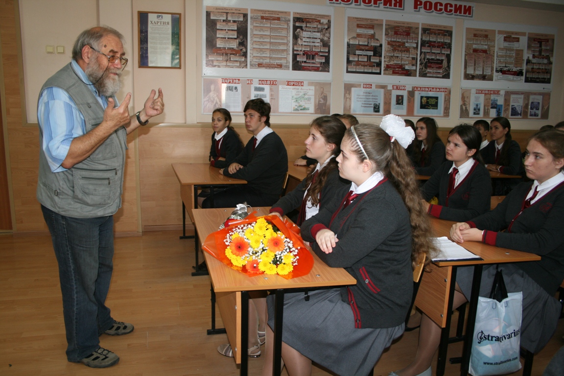 Члены гуманитарно-просветительского клуба «Зажги свечу» уже давно поддерживают сотрудничество со многими школами Новосибирска. В этот сентябрьский день их выбор пал на Вторую Новосибирскую гимназию. Вице-президент гуманитарно-просветительского Клуба «Зажги свечу», известный писатель Владимир Викторович Шамов признался, что он не в первый раз в этой школе и буквально в нее влюбился, поэтому то и уговорил своих друзей встретиться с ребятами.