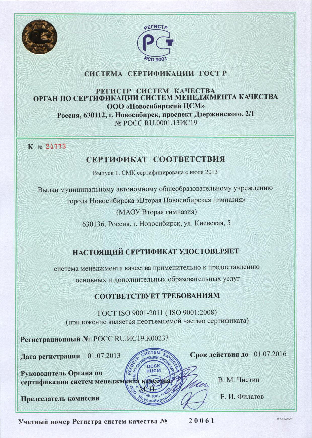 Полученный сертификат удостоверяет, что коллектив гимназии осуществляет основные и дополнительные образовательные услуги в соответствии с ГОСТ ISO 9001-2011 (ISO 9001:2008).
