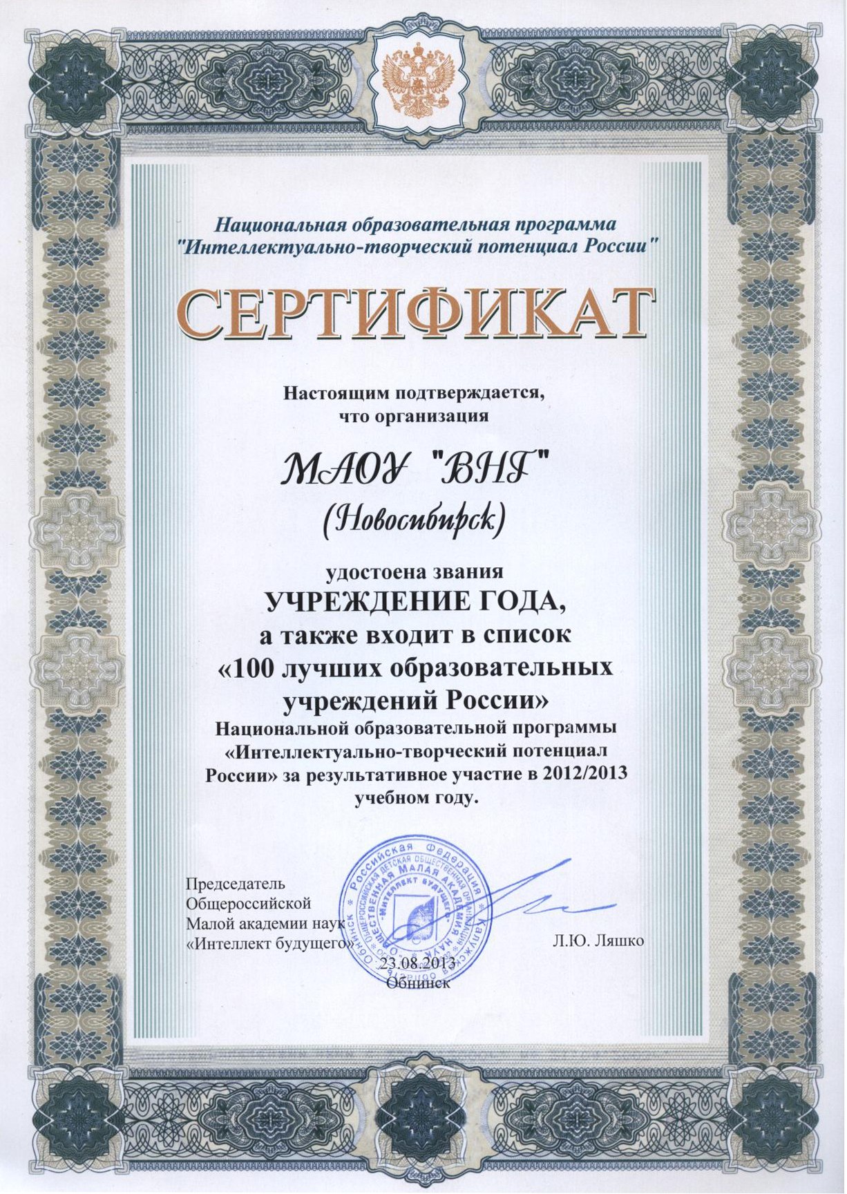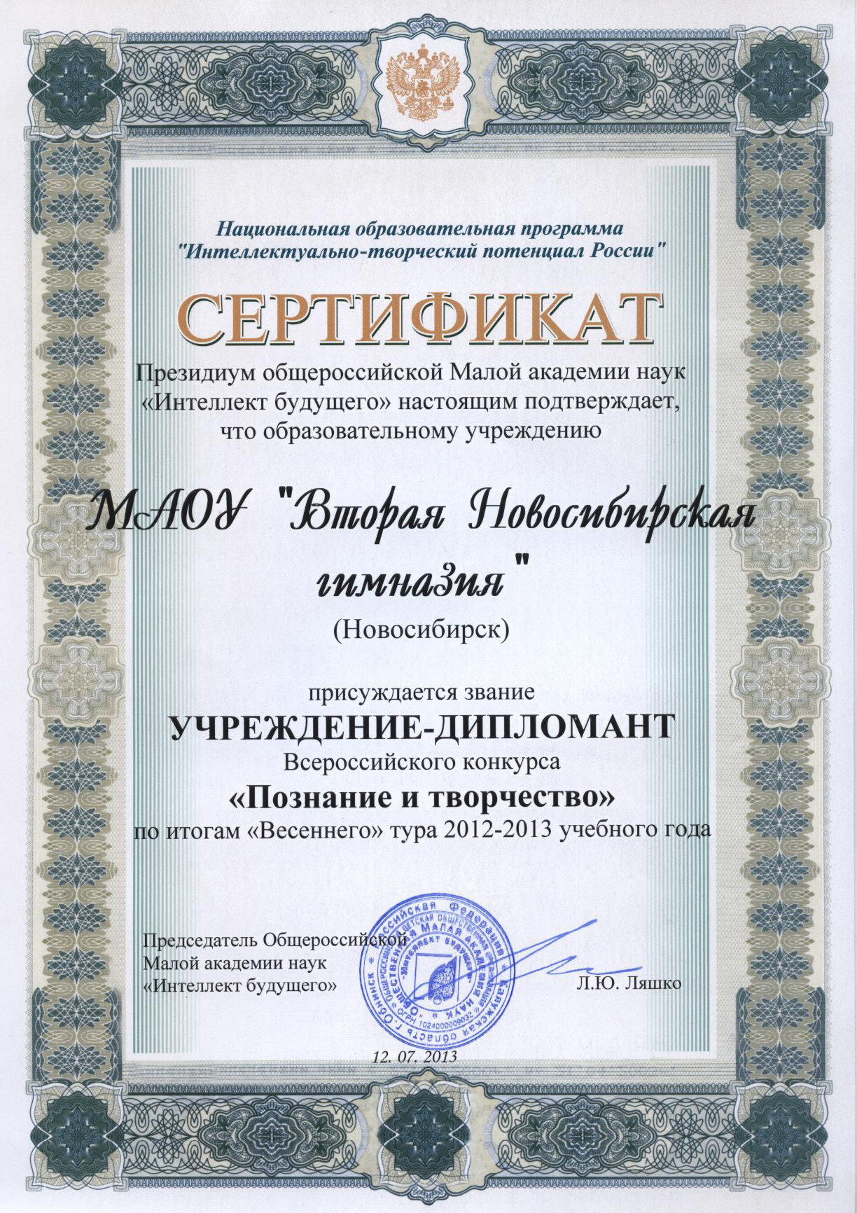 Вторая Новосибирская гимназия признана учреждением года по итогам участия в национальной образовательной программе «Интеллектуально-творческий потенциал России» за 2012/2013 год. В рамках программы проводятся предметные заочные конкурсы-олимпиады, конкурсы исследовательских и творческих работ по различным направлениям науки, техники, культуры, разработка социальных проектов, турниры, форумы, фестивали, научные конференции школьников.