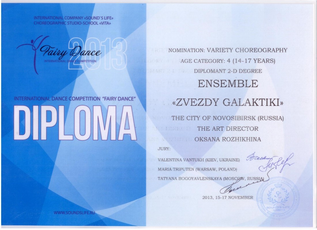 Старшая группа образцового коллектива «Студия танца «Звезды Галактики» МБОУ ДОД ЦВР «Галактика» Дзержинского района приняла участие в Международном конкурсе «Феерия танца», который проходил 15-17 ноября в Киеве. Вместе с новосибирцами в конкурсе приняли участие более 40 коллективов из Москвы, Петербурга, Киева, Одессы, Минска, Бреста, Харькова и т.д.