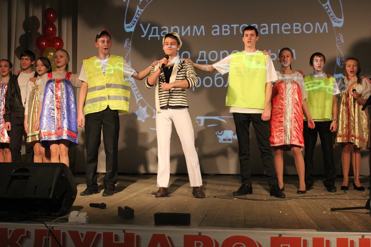 Наиболее зрелищным был конкурс «Домашнее задание». Он проводился в форме тематического выступления по пропаганде безопасности дорожного движения по теме: «Ударим автозапевом по дорожным проблемам…». Здесь команды вспоминали песни, в которых прослеживается тема дороги и автомобиля. Надо сказать, что знают ребята не только современные композиции, но и русские романсы.