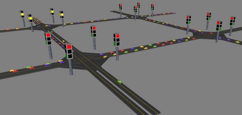 Созданная трехмерная модель «Умного перекрестка» (еще используется распространенное название «Умный светофор») позволяет варьировать степень загруженности автомагистралей, что наглядно иллюстрирует работу системы. Суть состоит в том, что «сообщающиеся» светофоры передают друг другу информацию о движущихся объектах и заторах, что позволяет создать оптимальное время ожидания.