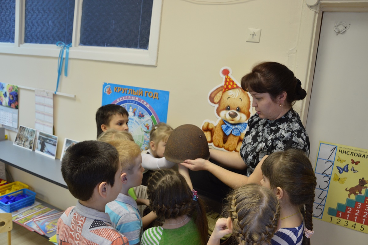По замыслу сценария детям в группу доставляется «музей в чемодане», открыв который они увидели в нем каску, пробитую пулей, солдатскую фляжку, керосиновую лампу, муляж гранаты, солдатский котелок… Дети рассматривали каждый экспонат и обсуждали его назначение. Затем шел разговор на тему Великой Отечественной войны: дети услышали голос Левитана об объявлении войны, увидели исторические фотоматериалы, посмотрели мультипликационный фильм «Солдатская сказка».
