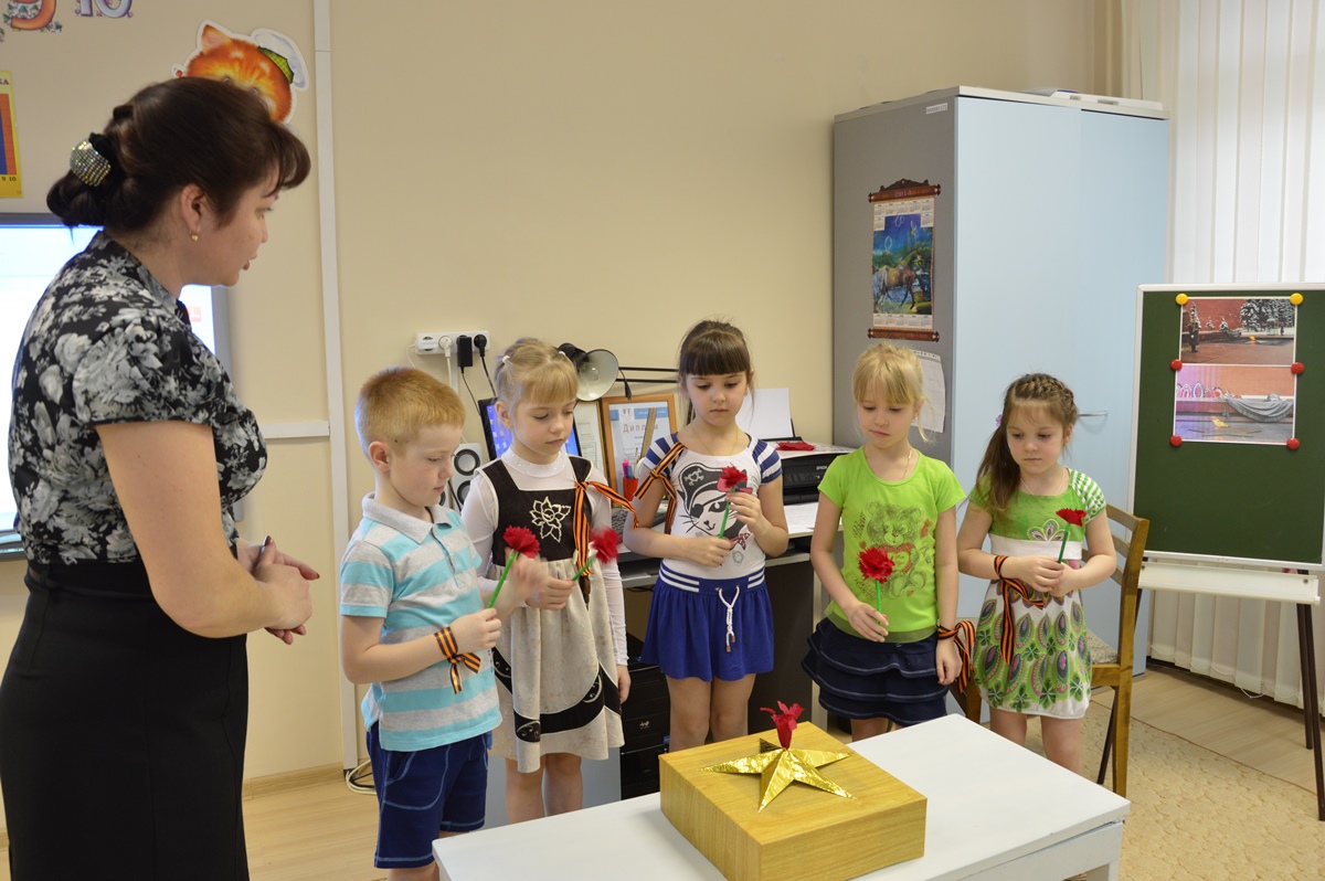 Во время обсуждения дети выражали чувства сопереживания и уважения к Ветеранам ВОВ, желание помочь им, сделать что-то полезное и доброе, говорили о значении Победы для нашего народа. Вместе с воспитателем дети сделали модель Вечного огня, цветы для возложения к нему. Закончилось занятие словами благодарности за Победу и песней «Над могилой в тихом парке».