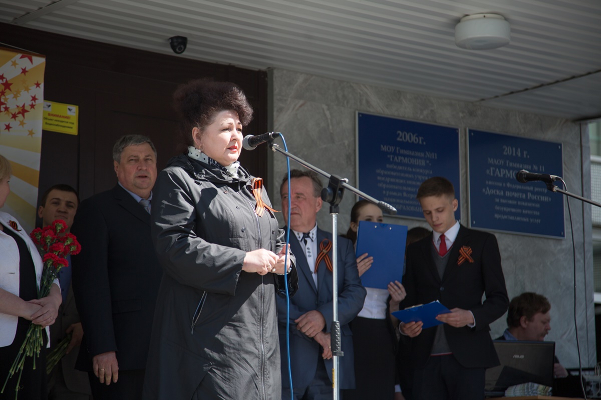 В свою очередь начальник Главного управления образования мэрии города Новосибирска Наталья Николаевна Копаева поблагодарила педагогический коллектив гимназии за патриотическое воспитание подрастающего поколения: « Я очень благодарна коллективу 11 гимназии за огромную работу по патриотическому воспитанию детей. Хочется сказать, что год семидесятилетия Победы в системе муниципального образования стал знаковым с точки зрения возрождения всех лучших традиций, в деле патриотического воспитания и гражданского становления личности. Очень важно то, что с нами сегодня живые свидетели тех событий, они нам с вами могут передать очень многое».