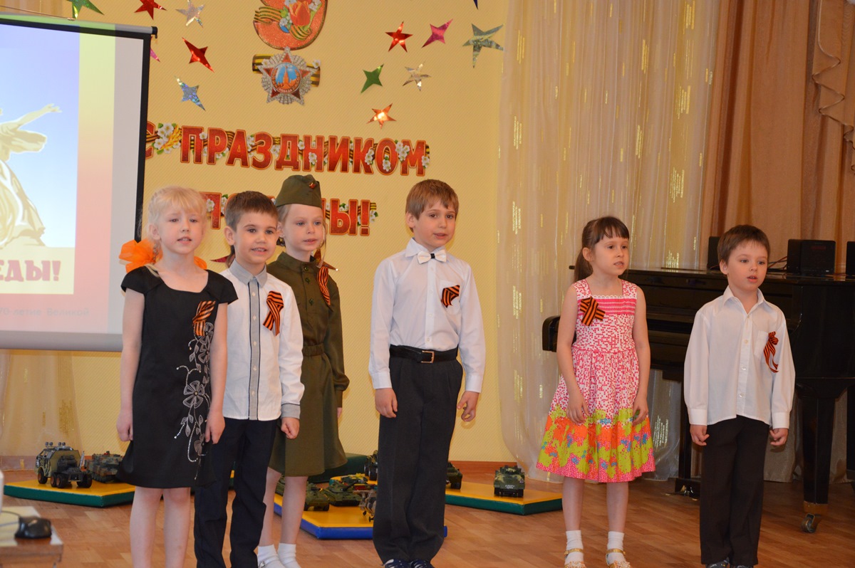 Музыкальным руководителем Назаренко И.И. и воспитателями старших и подготовительных групп был подготовлен и показан большой концерт «Великий День Победы» ветеранам ВОВ, труженикам тыла и детям военных лет. Воспитанники с большим проникновением читали стихи, пели песни, исполняли танцы и сценки. Гости были тронуты до глубины души не только концертом, но и подарками, изготовленными руками детей.