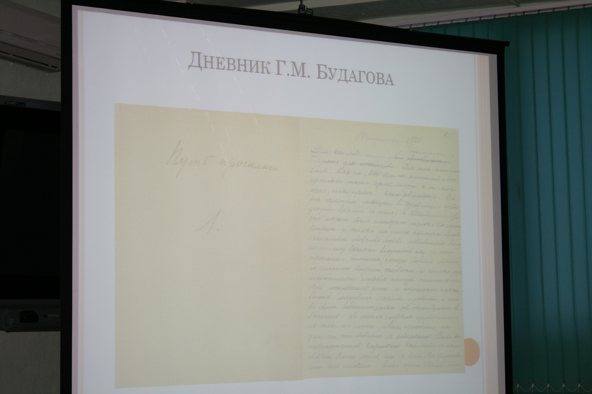 Заслуженный учитель России, руководитель краеведческого музея «У истоков города» Новосибирской классической гимназии № 17 Людмила Демьяновна Яковлева поведала о новой находке, уникальном архивном документе – рукописном личном Дневнике Григория Моисеевича Будагова, который хранится в Музее истории Западно-Сибирской железной дороги.