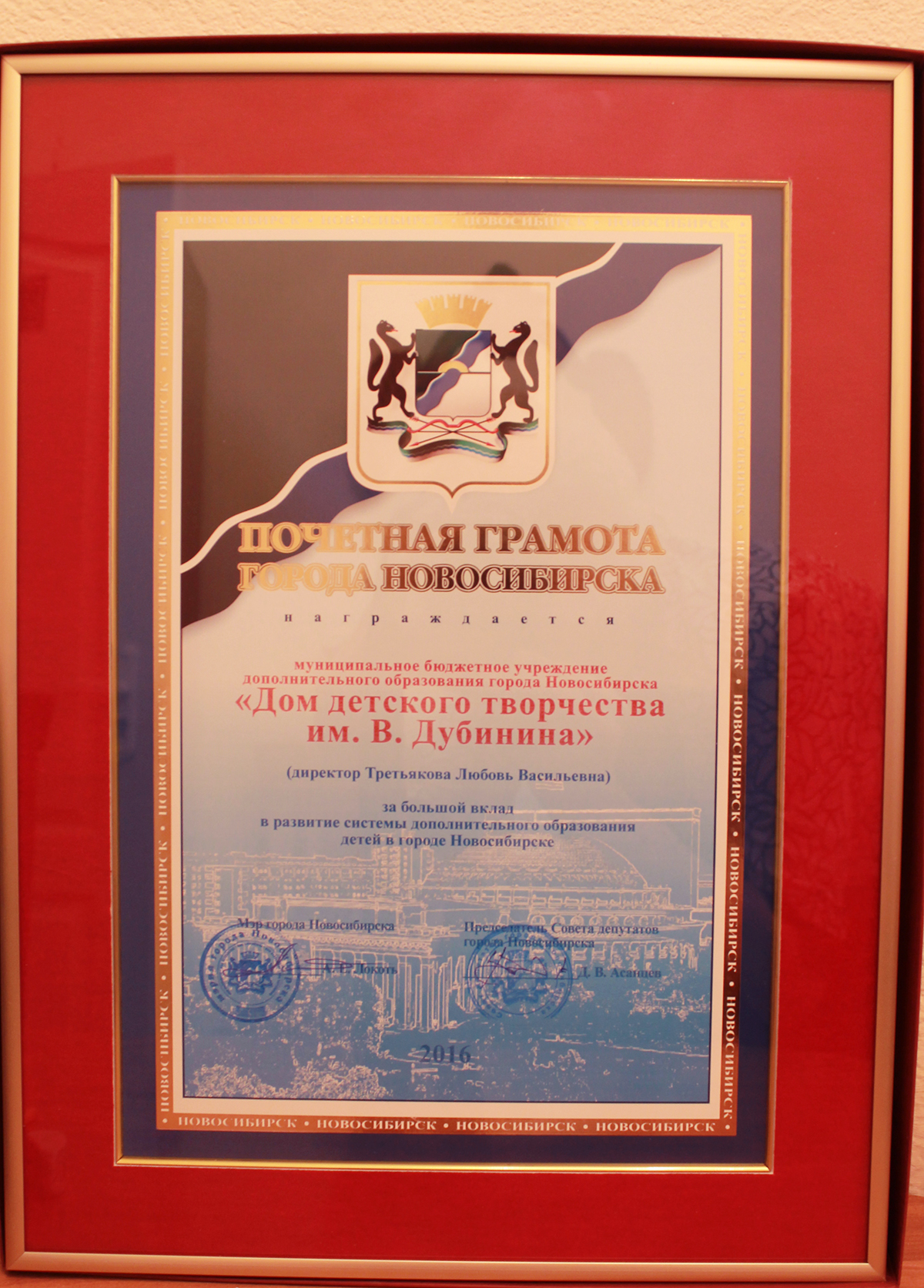 Почетной грамотой города Новосибирска награжден и Дом детского творчества им. В. Дубинина за большой вклад в развитие системы дополнительного образования города Новосибирска. Коллектив учреждения может заслуженно гордиться такой высокой наградой!