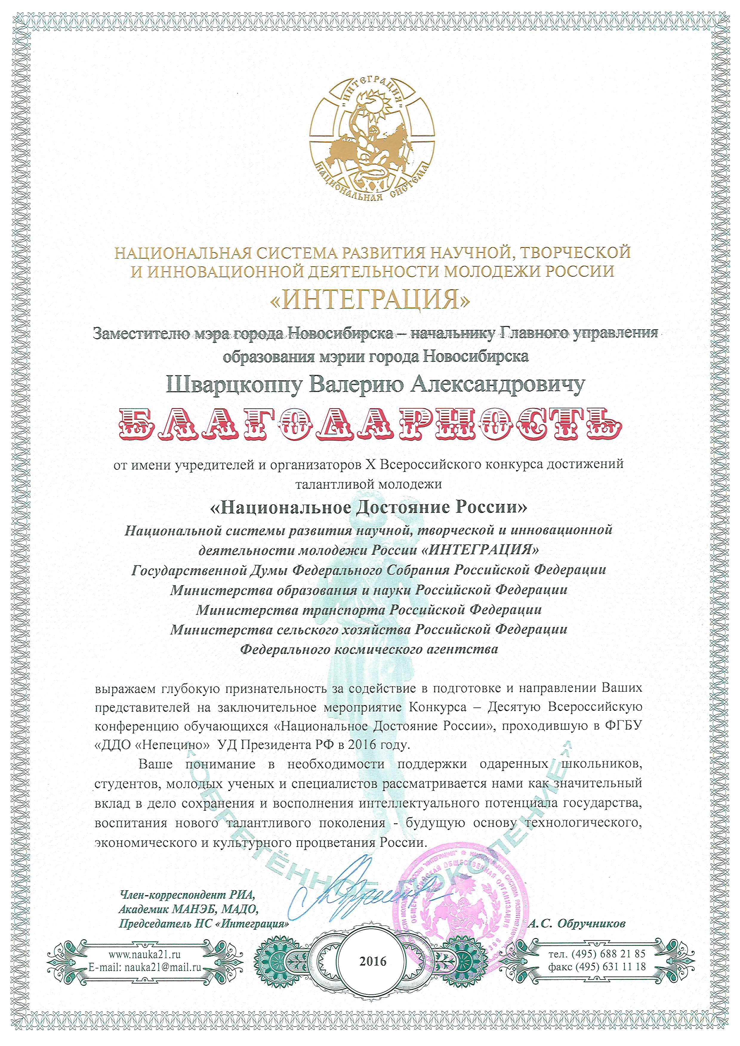 С 23 по 25 марта 2016 года в г. Москва (Непецино) состоялся очный тур Всероссийской конференции «Национальное достояние России», в котором в составе лицейской команды 6 учащихся МБОУ АКЛ имени Ю.В. Кондратюка достойно представили лицей и город Новосибирск, заняв 6 первых мест. Экспертное жюри конкурса оценило высокое качество представленных работ, и лицеисты были награждены дипломами I степени.