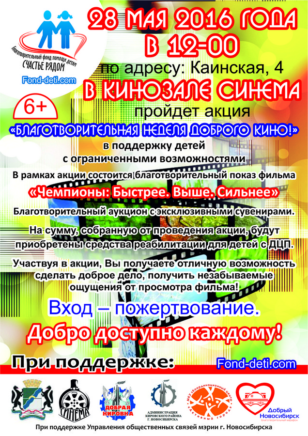 Благотворительный фонд помощи детям «Счастье рядом» приглашает на благотворительный показ фильма «ЧЕМПИОНЫ: Быстрее. Выше. Сильнее» 28 мая в 12-00 в кинозале «Синема» по адресу: Каинская, 4.