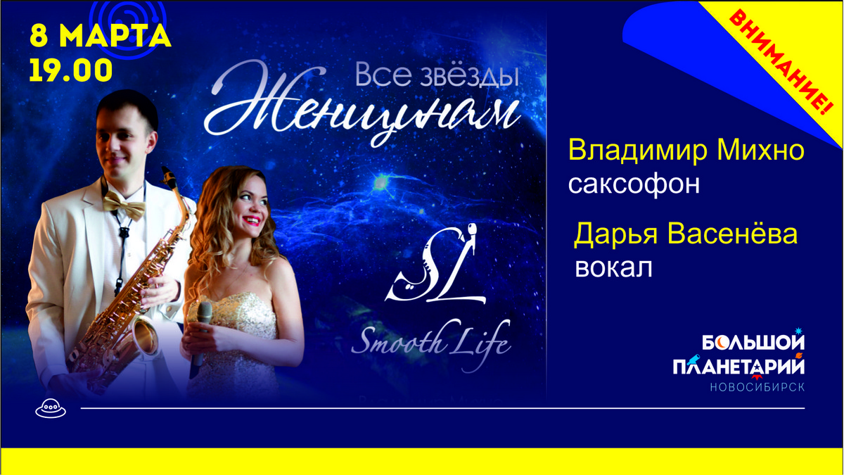 8 марта в 19:00 в большом новосибирском планетарии в рамках проекта «Звуки третьей планеты» пройдет концертная программа «Все звезды женщинам» от дуэта Smooth Life – Вокал и Саксофон в Международный женский день!