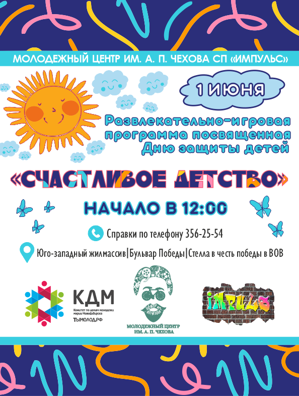 В предстоящую субботу, в первый летний день 2019-го года, Молодежный центр им. А.П. Чехова (структурное подразделение «Импульс») приглашает всех желающих посетить развлекательно-игровую программу «Счастливое детство», посвященную Дню защиты детей.