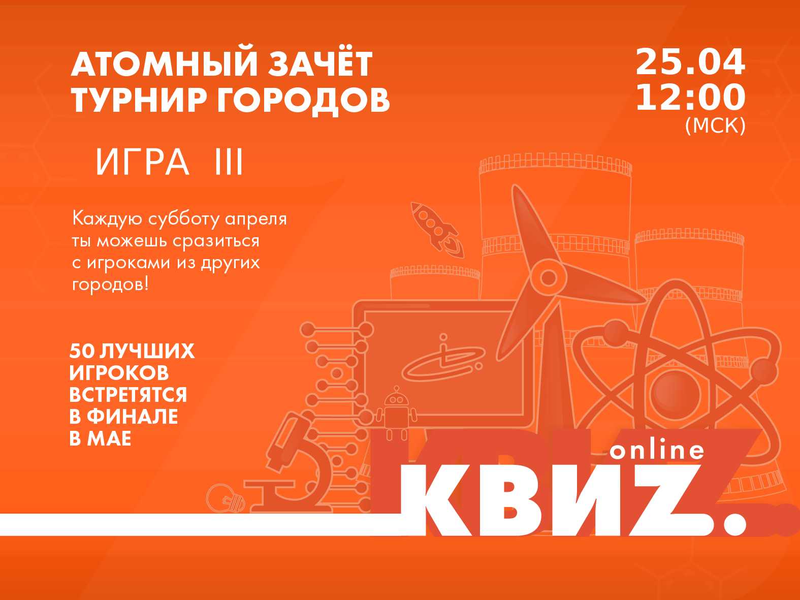 Третья игра состоится 25 апреля в 12:00 и будет посвящена трём темам: химия, литература и атомные технологии.