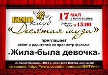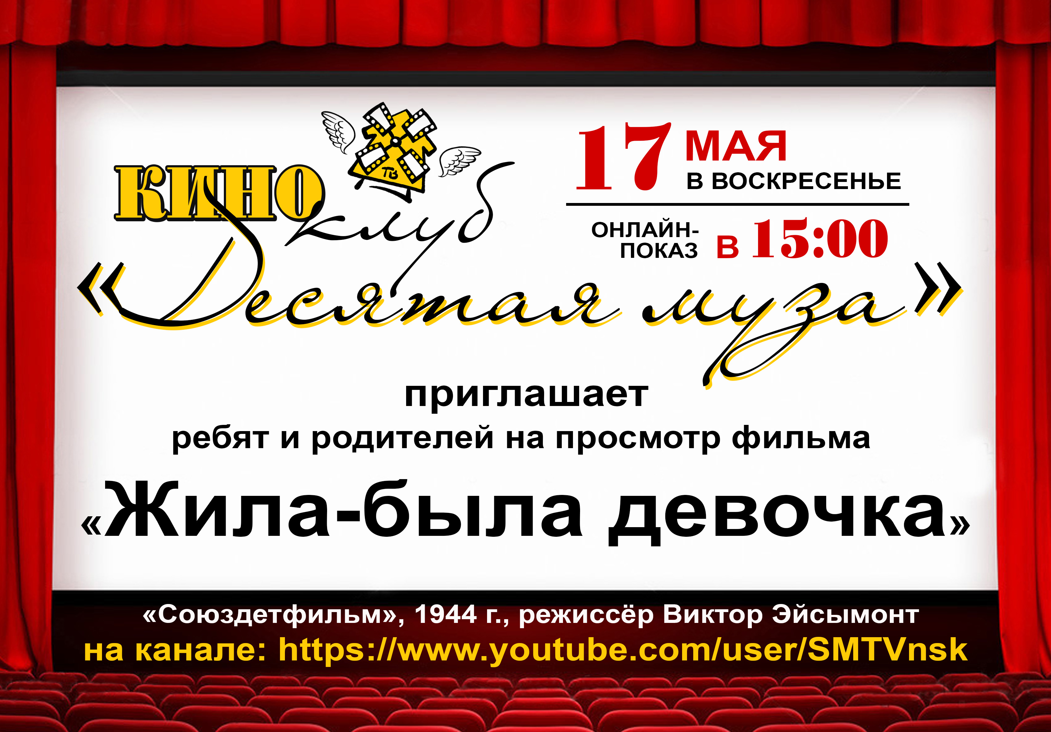 Дорогие друзья! ДЮЦ «Старая мельница» представляет анонс Киноклуба «Десятая муза» и приглашает к просмотру ребят, их родителей и всех желающих в ближайшее воскресенье! 17 мая в 15:00 состоится онлайн-показ художественного детского фильма на тему Великой Отечественной войны «Жила-была девочка», снятого в 1944 году в блокадном Ленинграде. Показ обзора и эпилога состоится на канале ДЮЦ «Старая мельница»: https://www.youtube.com/user/SMTVnsk.