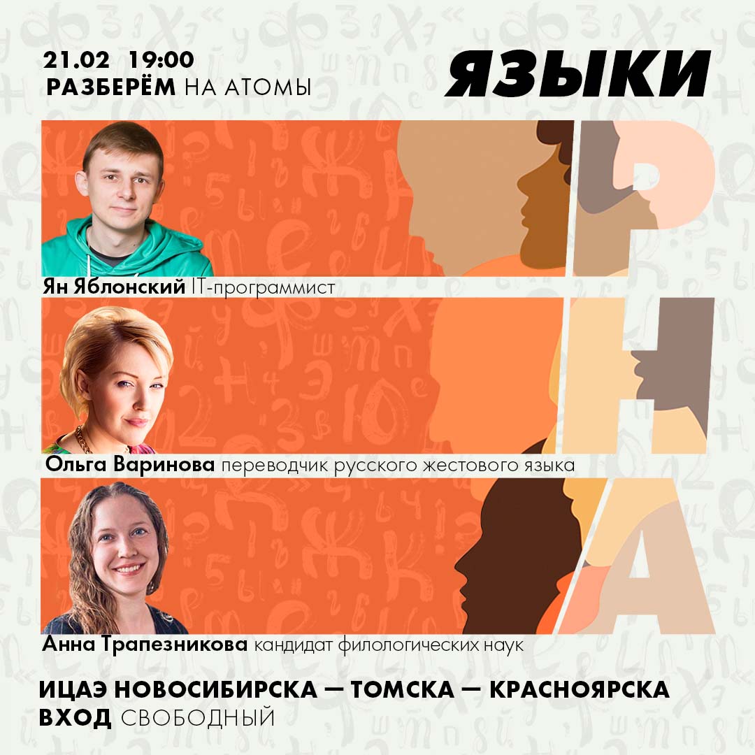 21 февраля ожидается сеанс связи между Новосибирском, Красноярском и Томском. Будем находить общий язык на научно-популярном ток-шоу «Разберём на атомы. Языки».