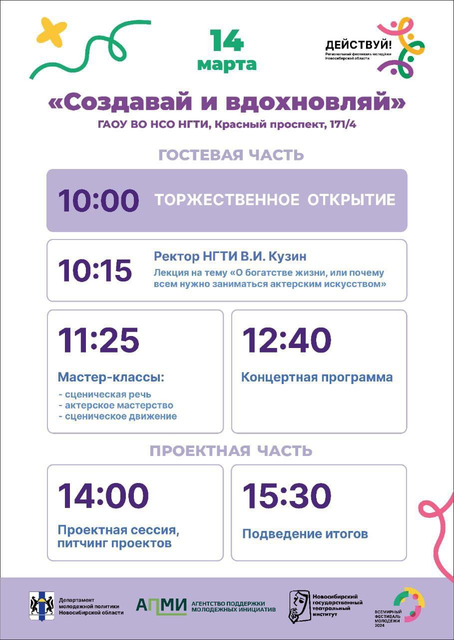 Новосибирский государственный театральный институт приглашает молодых людей, которые любят искусство и, в частности, театр, стать участниками фестиваля и посетить площадку НГТИ по направлению «Создавай и вдохновляй!».