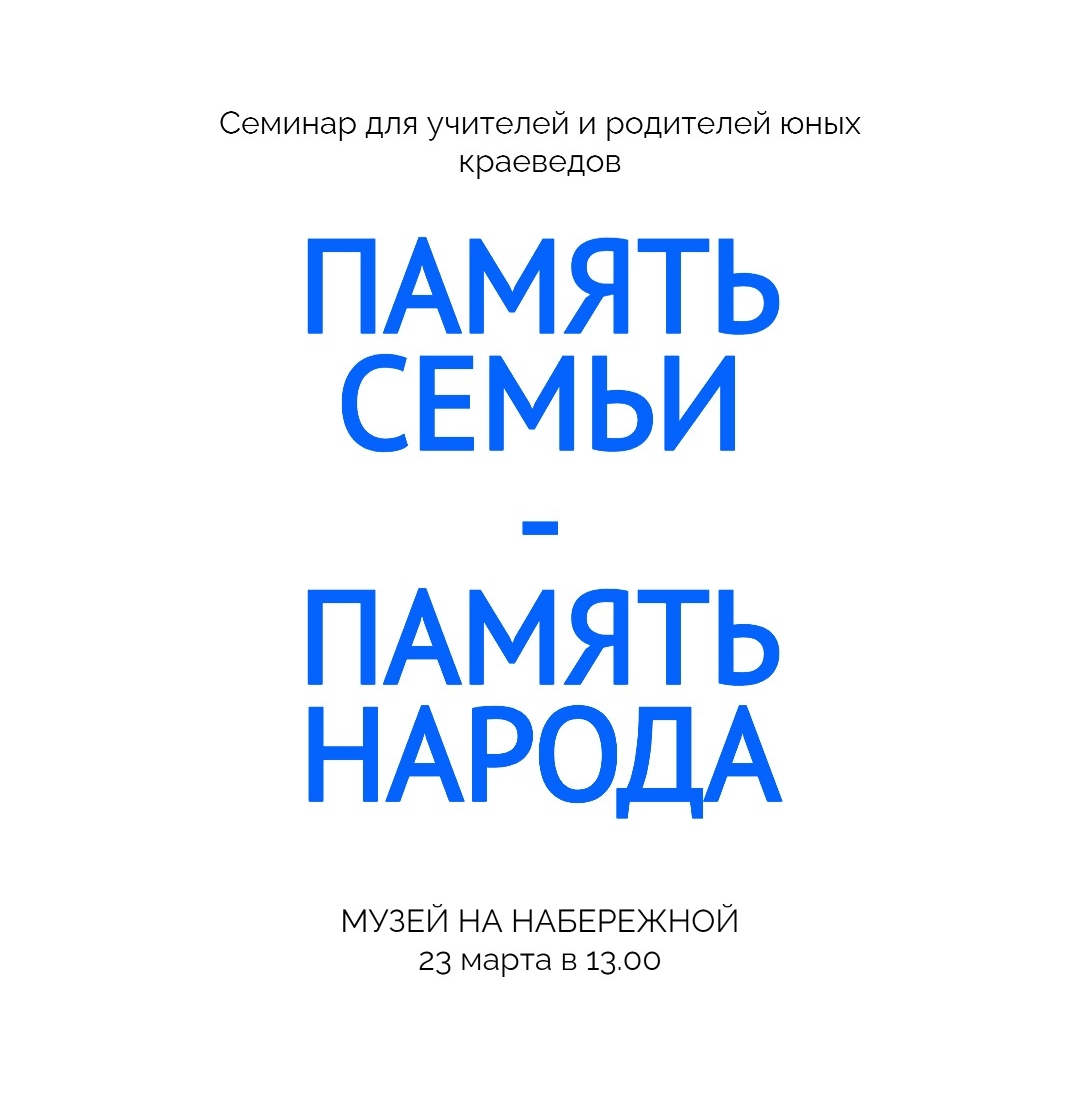 23 марта в 13.00 в «Музее на Набережной» (ул. Обская, 4) пройдет семинар «Память семьи – память народа», посвященный развитию методик создания краеведческих проектов посредством совместной работы учителей и сотрудников культурных и научных учреждений. «Музей Новосибирска» приглашает к участию краеведов, учителей, сотрудников школ и активных жителей г. Новосибирска.
