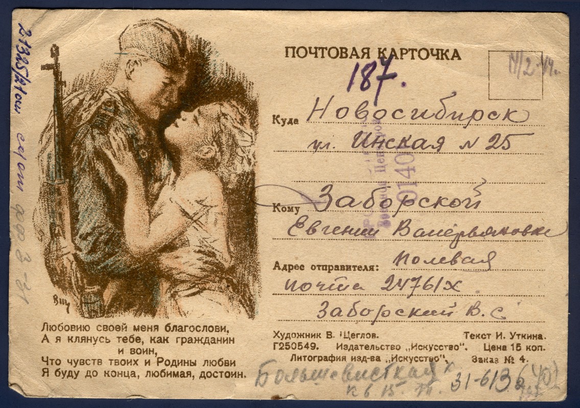 В фондах Новосибирского краеведческого музея хранится около 300 писем времен войны. Среди них есть разнообразные типы писем: знаменитые письма-треугольники, письма, написанные на типографских бланках, так называемые «воинские письма», почтовые карточки и талоны к переводам денежных средств с короткими записками.