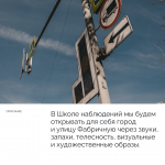 Школа наблюдений – это лекционно-практическая мастерская по анализу и восприятию городского пространства. Проект направлен на изучение, исследование города через звуки, запахи, обострение визуального восприятия и преобразование окружающей нас повседневности города.