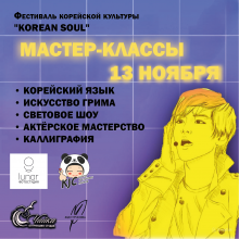13 ноября в рамках Фестиваля корейской культуры "Korean soul" Молодёжный центр им. А. П. Чехова приглашает посетить открытые занятия по направлениям: