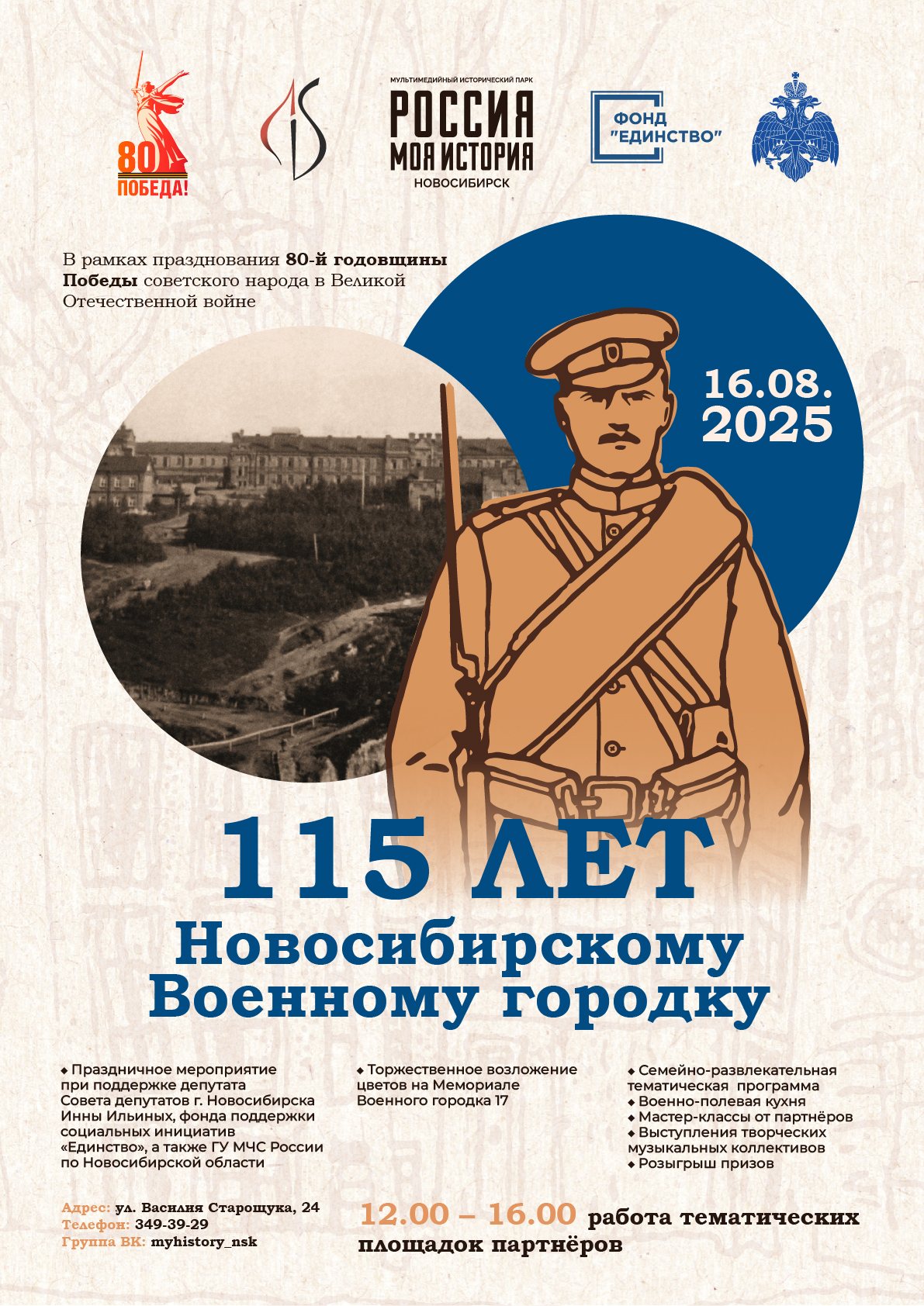 Каждый год на площадке исторического парка «Россия – Моя история» проходит праздничное мероприятие, приуроченное к началу строительства в 1910 г. первых военных казарм в Новониколаевске. Тогда был заложен фундамент самого большого в Томской губернии военного городка, рассчитанного более чем на 3 000 человек. Возведение комплекса в восточной части Новониколаевска завершилось за год до начала Первой мировой войны – летом 1913 г. Целое столетие Военный городок был крупнейшей военной базой Сибири. Через учебу и службу здесь прошли десятки тысяч защитников Отечества: солдаты и офицеры Русской императорской армии, вооруженные формирования участников Гражданской войны, бойцы и командиры Рабоче-крестьянской Красной армии, солдаты и офицеры Советской армии, а также воины Вооруженных Сил Российской Федерации.