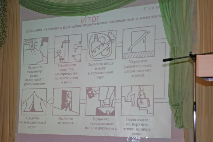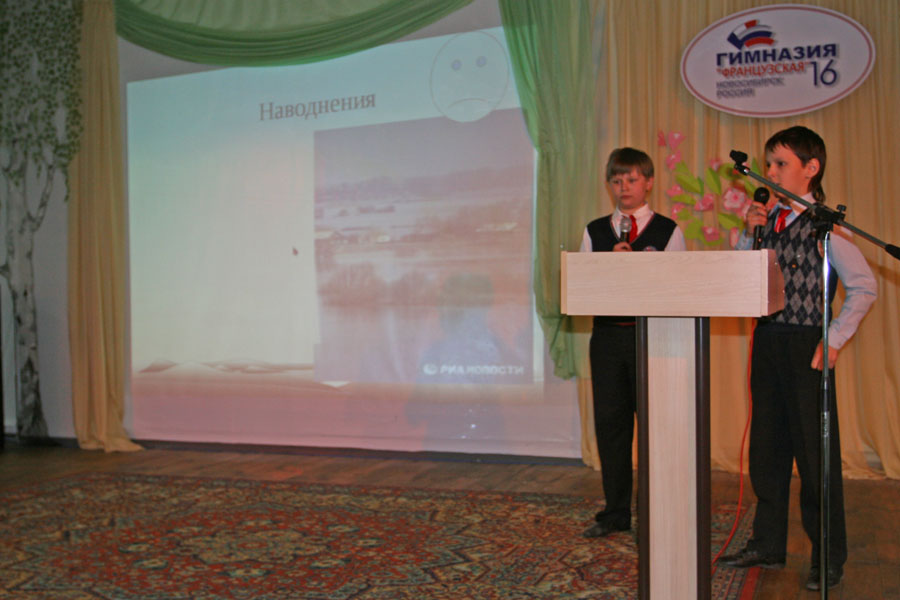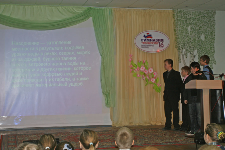 Была рассмотрена, например, тема наводнения – данную тему выбрали сразу две группы учащихся, представлены они были по-разному. Обсуждались следующие аспекты вопроса: причины, признаки приближения наводнения, что необходимо сделать, если наводнение началось, какие мероприятия необходимо провести по профилактике и уменьшению ущерба от наводнения в часто затопляемых районах. Один из проектов был единогласно признан лучшим и жюри, и участниками мероприятия, этой работе было присуждено первое место в конкурсе.