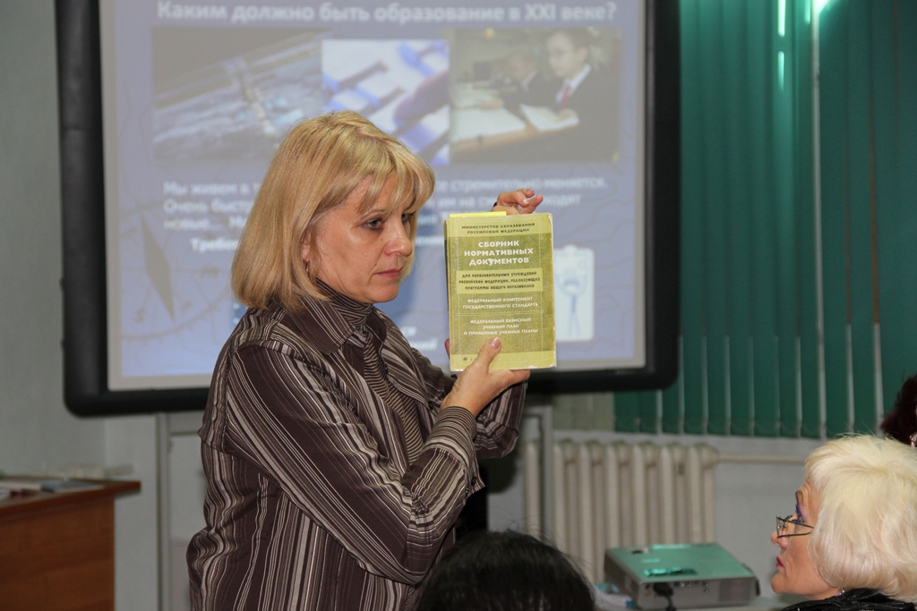 В начале своего выступления Людмила Викторовна отметила основные изменения, которые произошли в образовании за последний период. С переходом на образовательные стандарты второго поколения изменились цели образования. Сегодня акцент в образовательном процессе делается на формировании личности, опираясь на системно-деятельностный подход. Соответственно меняются и требования к организации образовательного процесса: к структуре учебных программ, к условиям их реализации и результатам образования. Система этих новых требований и есть новое содержание ФГОС.