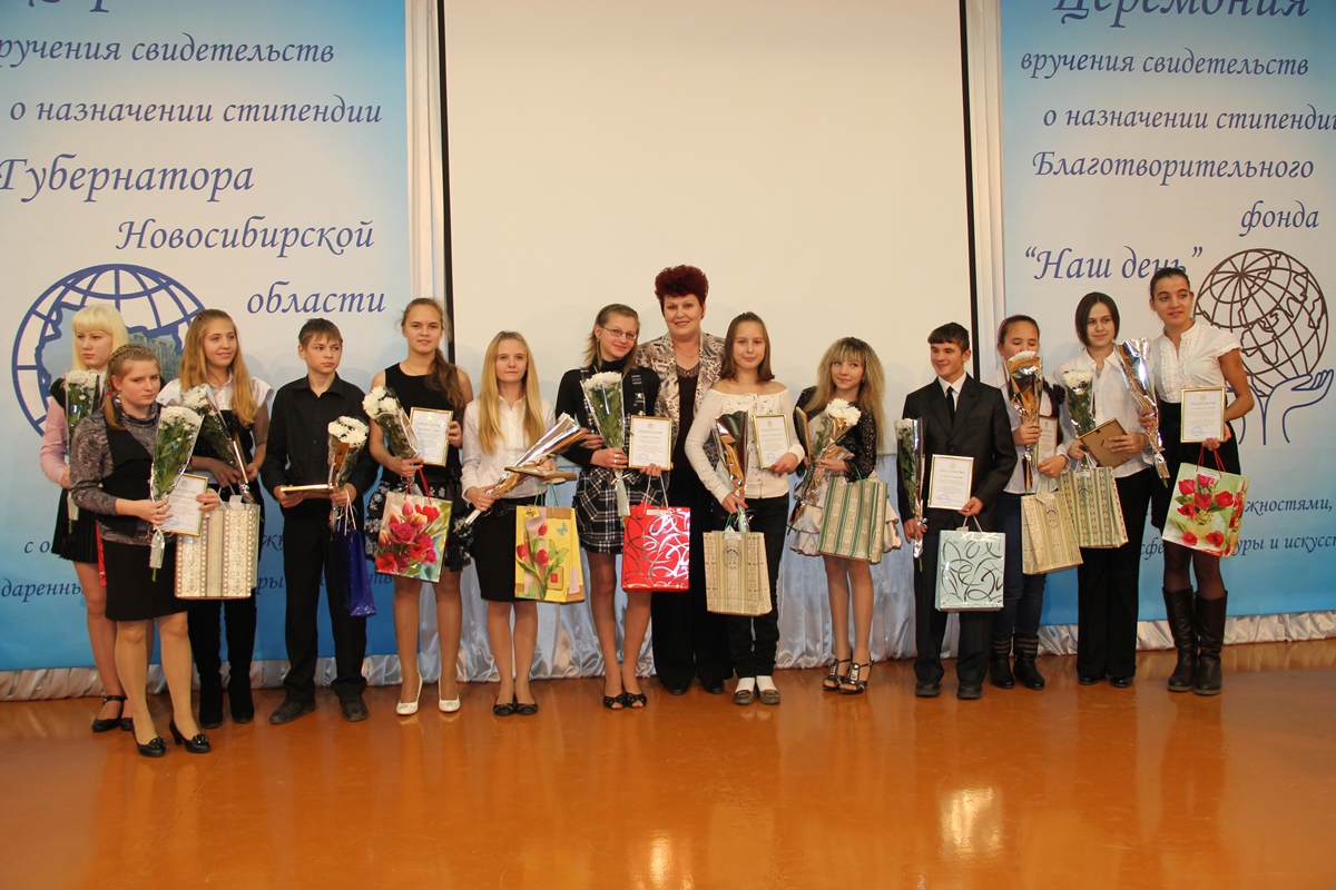 В этом году стипендиатами Губернатора Новосибирской области и Благотворительного фонда «Наш день» стали 50 детей из 22 районов и городов области. Ребята являются лауреатами фестивалей, конкурсов, выставок, олимпиад различного уровня, принимают активное участие в культурной, творческой жизни области, района, города.