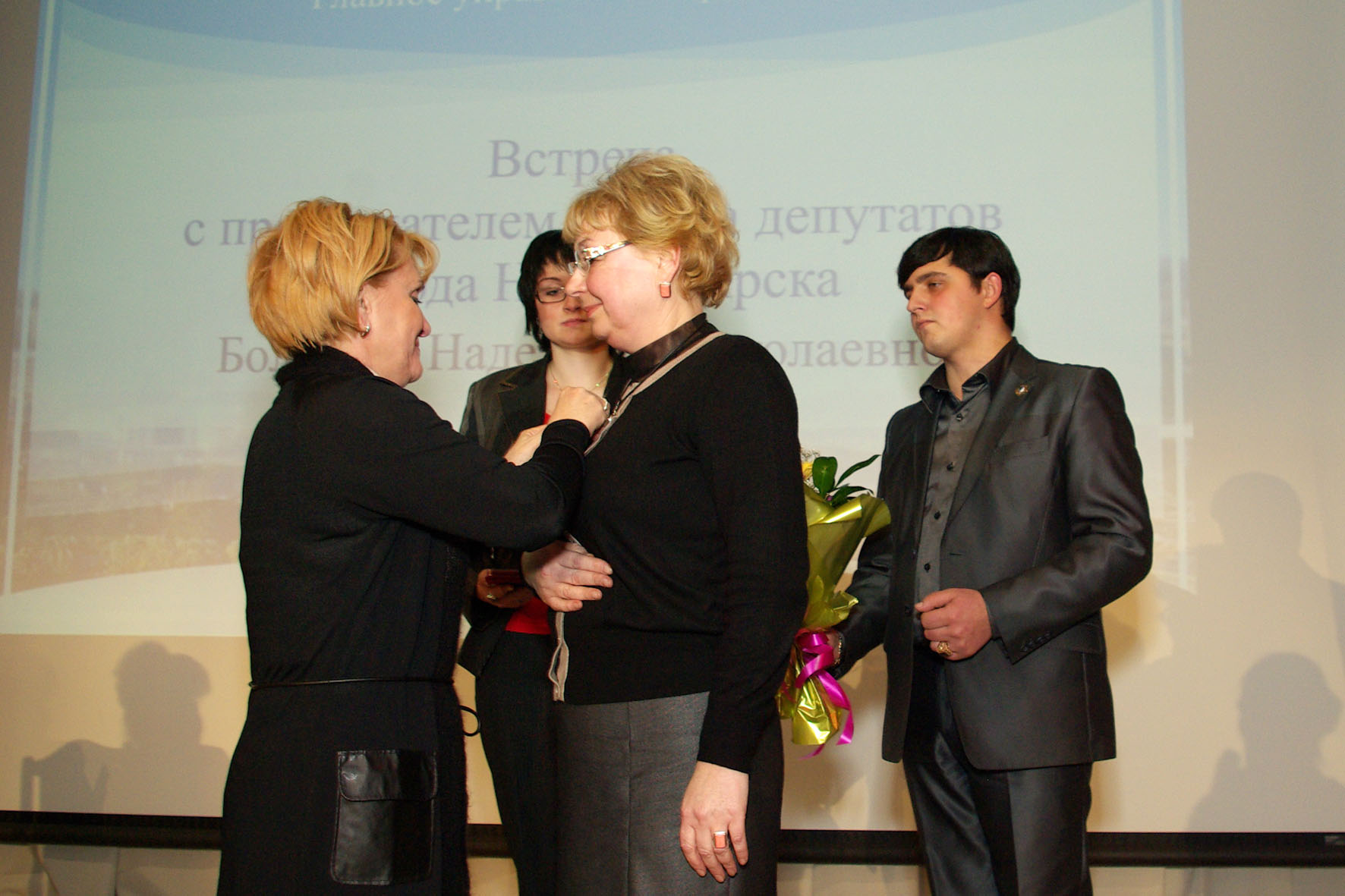 В соответствии с программой проекта 29 ноября в Доме учителя состоялась встреча с председателем Совета депутатов города Новосибирска Надеждой Николаевной Болтенко. Во встрече принимала участие начальник Главного управления образования мэрии города Новосибирска Наталья Николаевна Копаева.