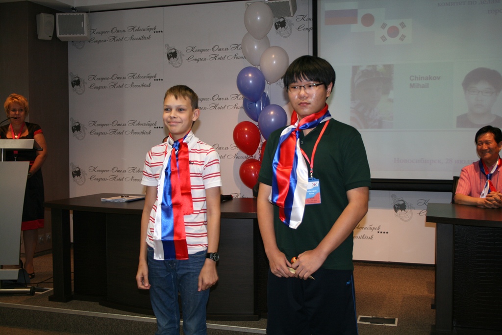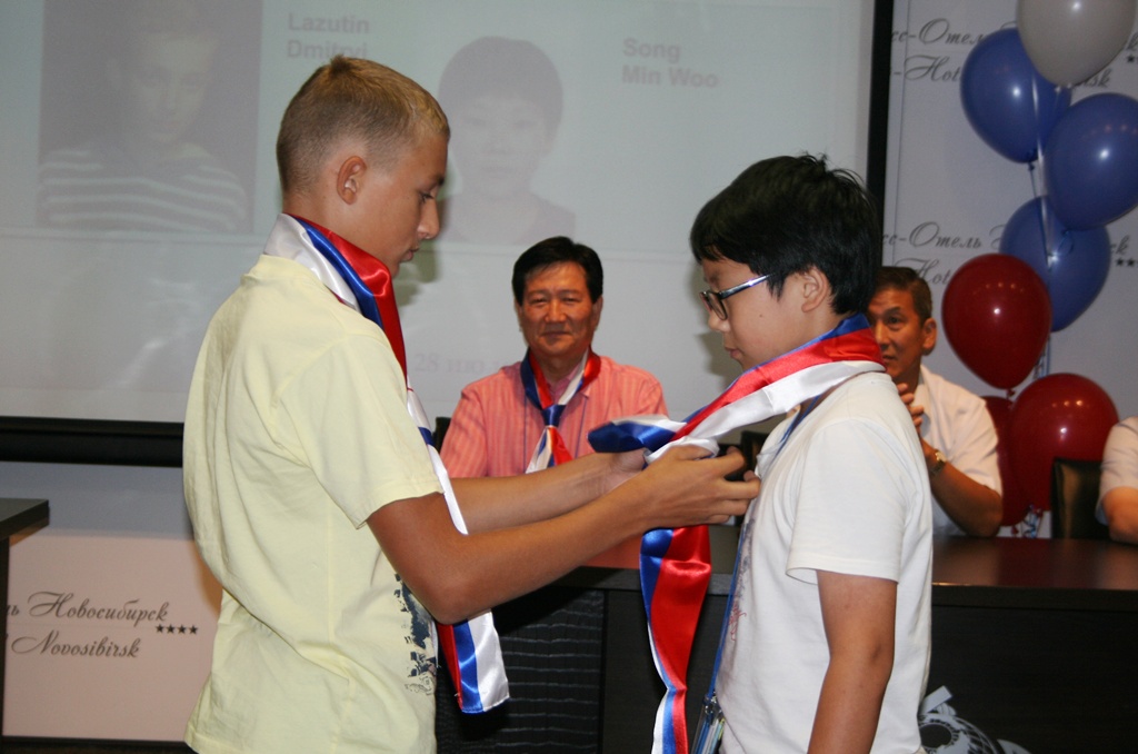 В заключение торжественной церемонии русские ребята подарили своим друзья из Японии и Кореи памятные сувениры, повязали шарфики цвета российского флага и, под дружные аплодисменты, увели к своим мамам и папам. Впереди детей из Саппоро и Тэджона ждет немало интересного и вкусного. Ведь недаром мамы еще с утра напекли пирожков, блинов, налепили пельменей. Многие семьи хотят свозить гостей к себе на дачу, показать ночные фонтаны Новосибирска, прокатить по детской железной дороге.