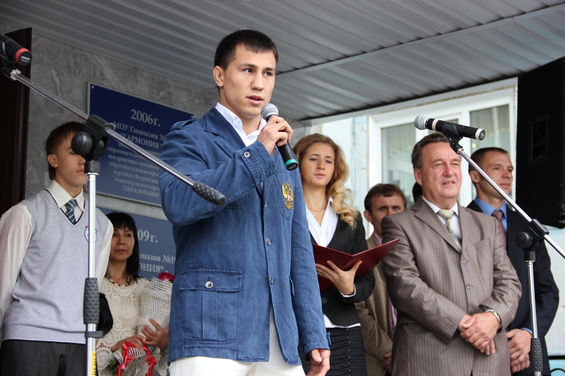 Поздравить школьников пришли представители районной администрации, отдела образования, депутаты, а также олимпийский чемпион Лондонской олимпиады по греко-римской борьбе Роман Власов, бывший ученик гимназии.