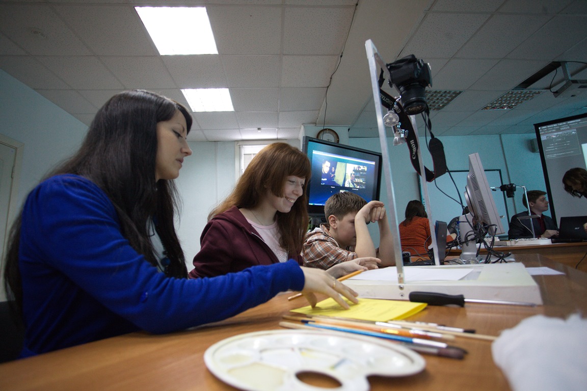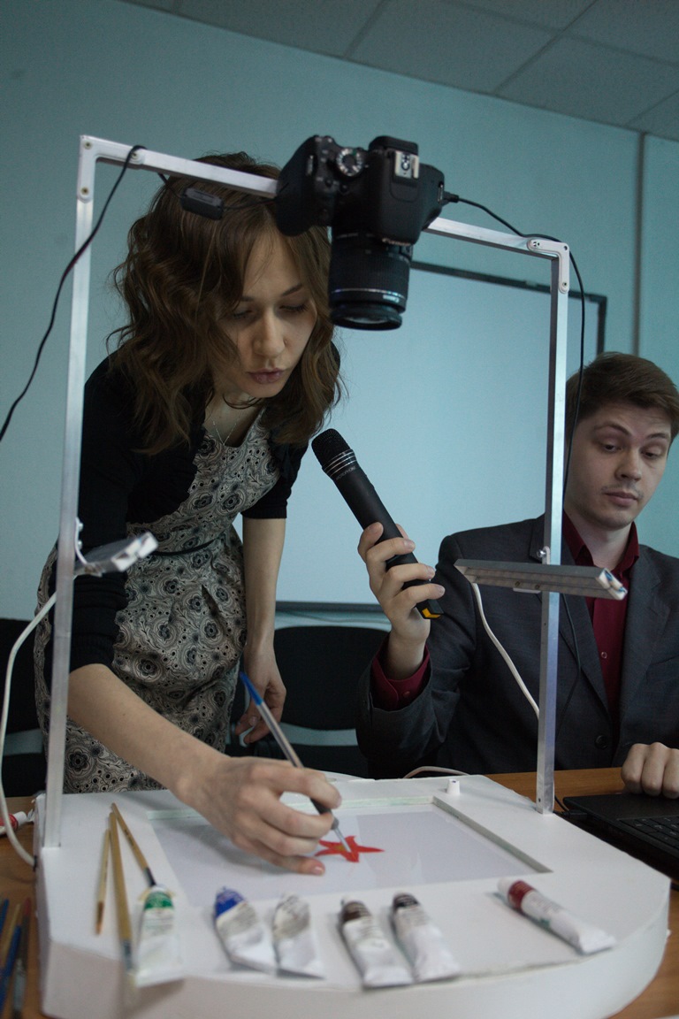 От теории перешли к практике. Участники мастер-класса разделились на три команды, каждая из которых должна была в течение 20 минут создать свой анимационный ролик в технике «живопись на стекле». Тема – повышение уровня образования, грамотности молодежи, интереса к чтению. Дело в том, что именно эта проблема, по итогам голосования, набрала наибольшее количество голосов.